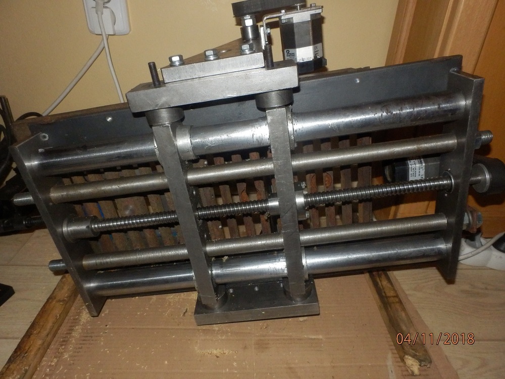 Hlavní pojezd Y je z přesných tažených hranolů a broušených tyčí z motocyklových tlumičů 33mm (kovošrot). Na této ose jsou futra soustružená z hliníku přesně na rozměr tyčí. Všechny díry v hranolech jsou vrtány najednou v soustruhu. Dosáhnout na stoletém vyběhaném Plauertu +/-0,01 není žádná prdel, ale dal jsem to. Největší problém je samozřejmě tyhle rozměry dobře změřit.