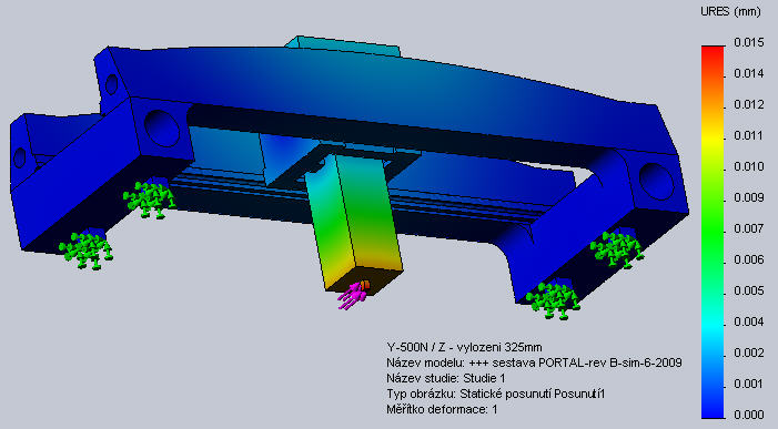 Příčník je svařenec a pevnostně to jistě sedí, ale jak se to bude chovat při opracování. Může se to neskutečně kroutit po každý šponě a na všechny strany. Ty žebra na příčníku =mnoho svarů ( značné vnitřní napětí, bylo by dobré to žíhat na odstarnění vnitřního pnutí před opracováním). Nezkoušel jsi udělat víc variant toho příčníku?. Ve škole jednou uváděl učitel jako príklad příčníku OBS (obráběcího stroje) pravidelný svařenec 4 trubek ? ( svary tam byly rozhozeny nebyly průběžné)