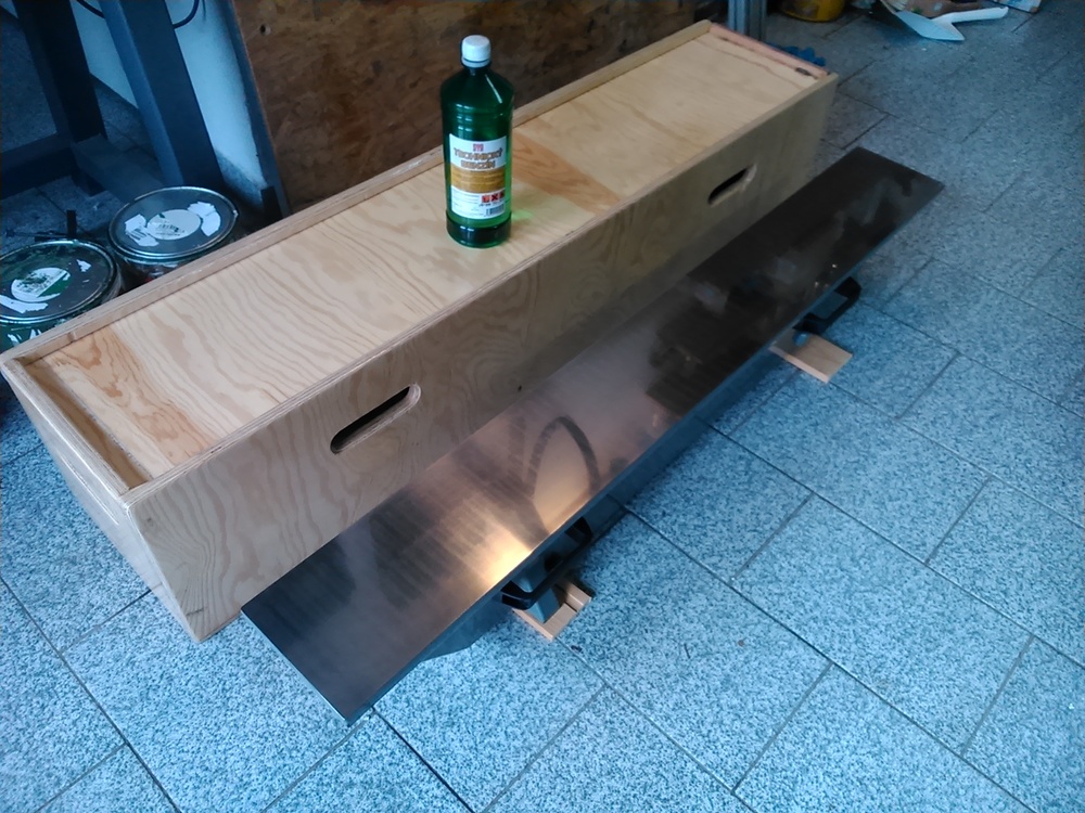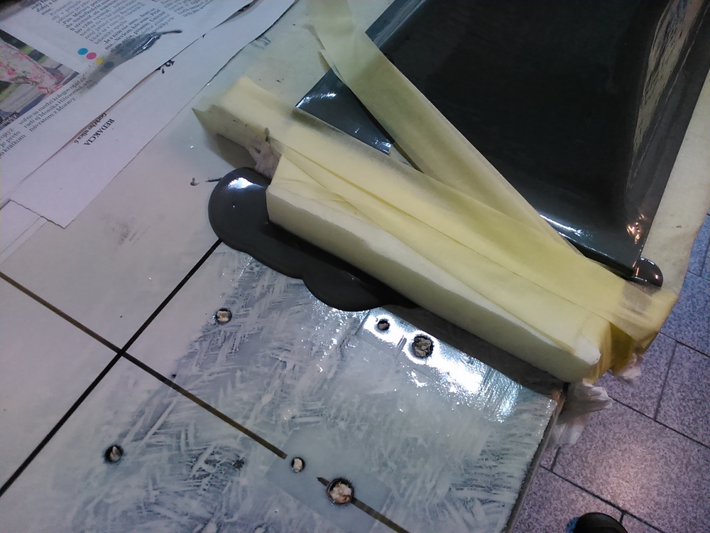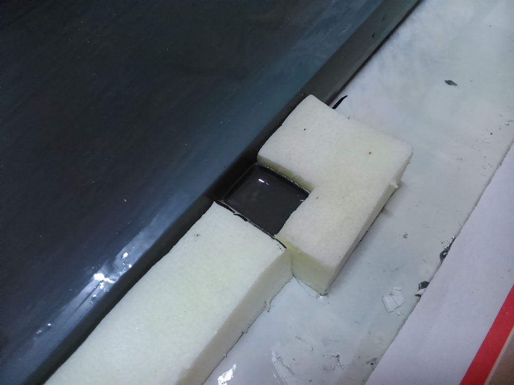 Pri odlievaní strednej časti som pravítko nechal ležať na krajných plochách len vlastnou váhou a obvod som utesnil obojstrannou páskou (páska na koberce) a vystužil kúskami styroduru. Sila vyvodená tlakom epoxidu pri vstrekovaní (použil som kartušu na lepidlo a pištol) však nadvihla 20 kg vážiacu masterdosku, takže som musel dosku zasa zložiť, všetko vyčistiť a opakovať s upnutým pravítkom a opatrne vstrekovať hmotu, keďže aj malý tlak môže na veľkej ploche vyvodiť veľkú silu. Pri druhom pokuse vstrekovania som okrem upnutia masterdosky svorkami zároveň kontroloval jej nadvihnutie hodinkami.