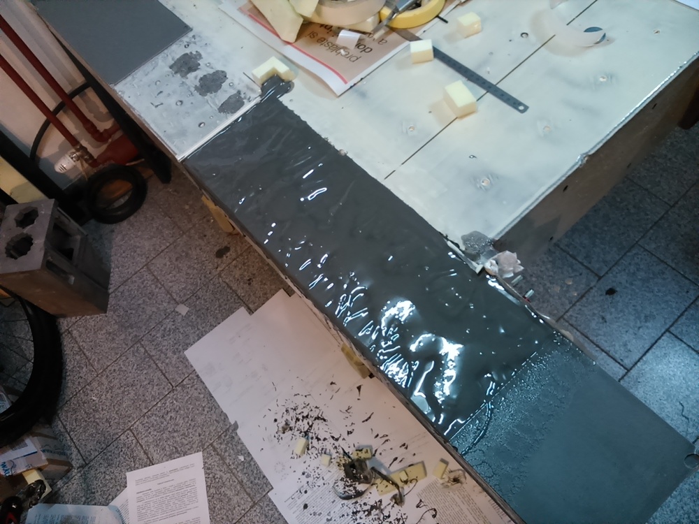 Po vyrovnaní povrchu betónovej dosky do vodorovna najprv prebehlo odlievanie dvoch plôch na koncoch ľavej strany dosky. Štrbina hrúbky asi 3,5 mm bola zabezpečená tak že masterdosku som položil na tri podložky umiestnené pod voľnou plochou masterdosky, teda medzi odlievanými plochami. Utesnenie sa mi osvedčilo z kombinácie obojstrannej pásky a styroduru.