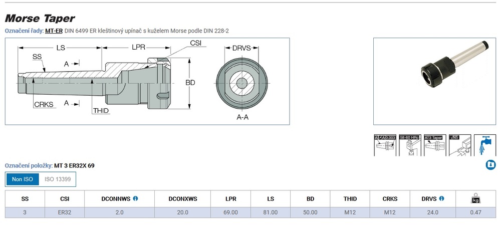ER 32 kleštinový upínač s kuželem Morse 3 podle DIN 228-2