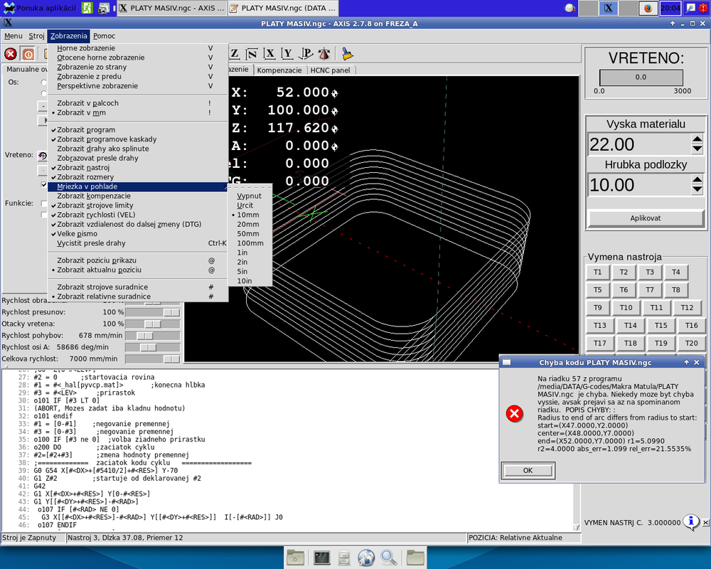 Ahojte. Ešte to tu žije? Dakujem velmi pekne za preklady. Ale potrebujem radu. Zamenil som nazvy chladenie a odsavanie na chladenie a hmla tak aby mi to pasovalo s fusion M kodmi. Skusil som vytvorit dalsie okienko v axis.tcl s nazvom lube ktore by som pouzil ako odsavanie. Neviem este ku akemu kodu je to pripísané ale to uz by som doriešil (možno). No problem je ze tlacidlo sa nevytvorí ale ak spustim linux a zapnem ho tak sa mi zopne 3tie rele automaticky. To by nebol problem zmenit z True na False ale aj tak nevidím to tlačidlo. Nejaky nápad? Ďakujem