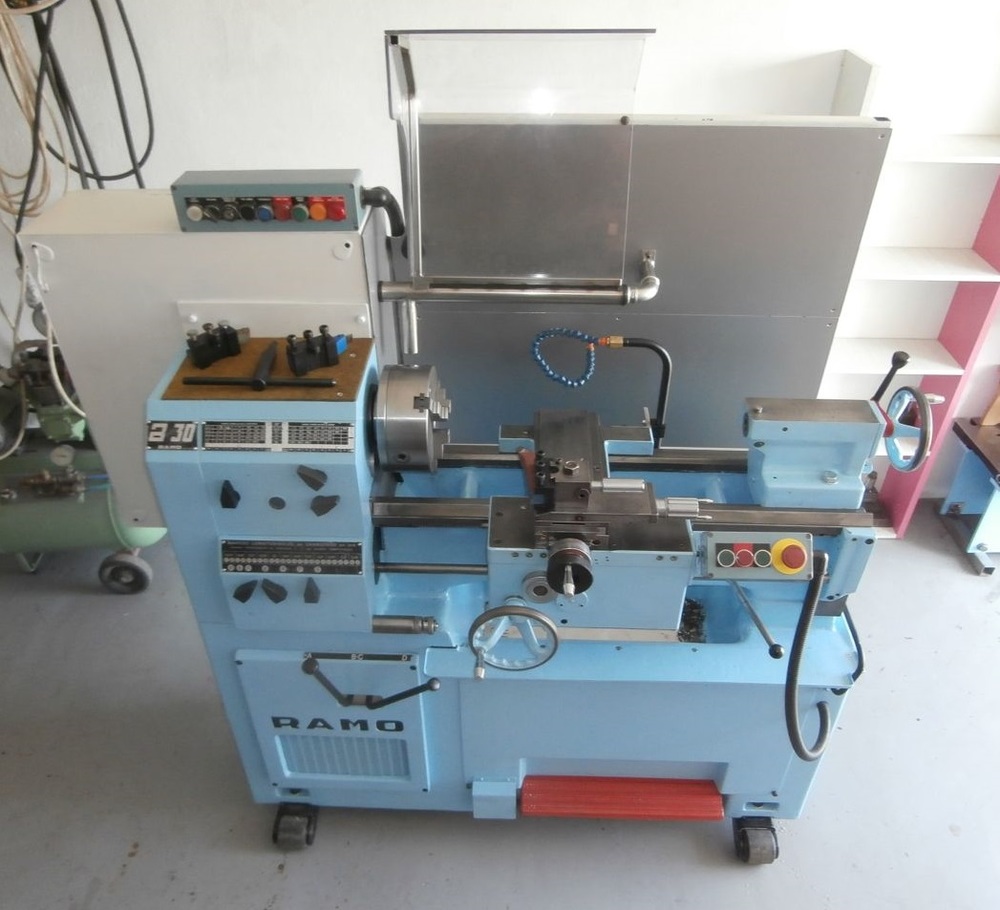 Jedná se o soustruh RAMO A30 francouzké výroby, velmi kvalitně zpracovaný, s litinovým podstavcem a širokým ložem (230 mm). Točný průměr 300 mm, točná délka 500 (nebo 700). Váha stroje ca 700 kg. Strojní podélný i příčný posuv. Otáčky 53 až 2000 ot/min.