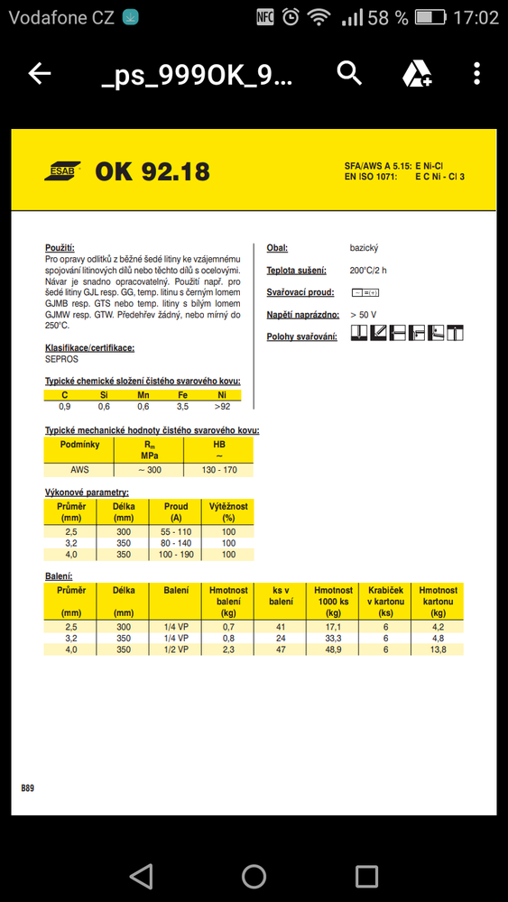 b3nd3r píše: 8. 5. 2019, 7:13 Jo, jde. Elektrody jsou bud na stridavy, nebo se davaji na + . Jedna se o OK 92.18 nebo NiCl jak psal Habitat3. Rika se jim niklovy. Jen teda jedna 2,5 elektroda stoji 50Kc.