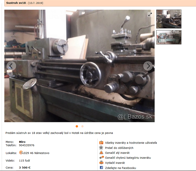 Pán je vtipálek. Transmisák předělaný na pohon klínovými řemeny, lože rezaté, suport odrbaný a cena 45 tis. A ještě se chlubí, že koupil za 60 tis. Motor na 230 V, takže to bude tahoun