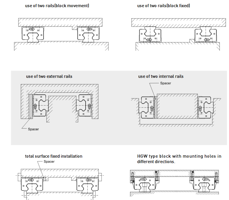 Většinou se používá možnost doražení obou kolejnic vždy na jednu jejich boční plochu rovnoběžně frézovaných drážek v nějaké masivní základní desce + dále jednu řadu (pár) vozíku dorazit k vyfrézované hraně pohyblivé desky (druhý pár vozíku nemá definovanou polohu aby uložení nebylo přeurčené).
