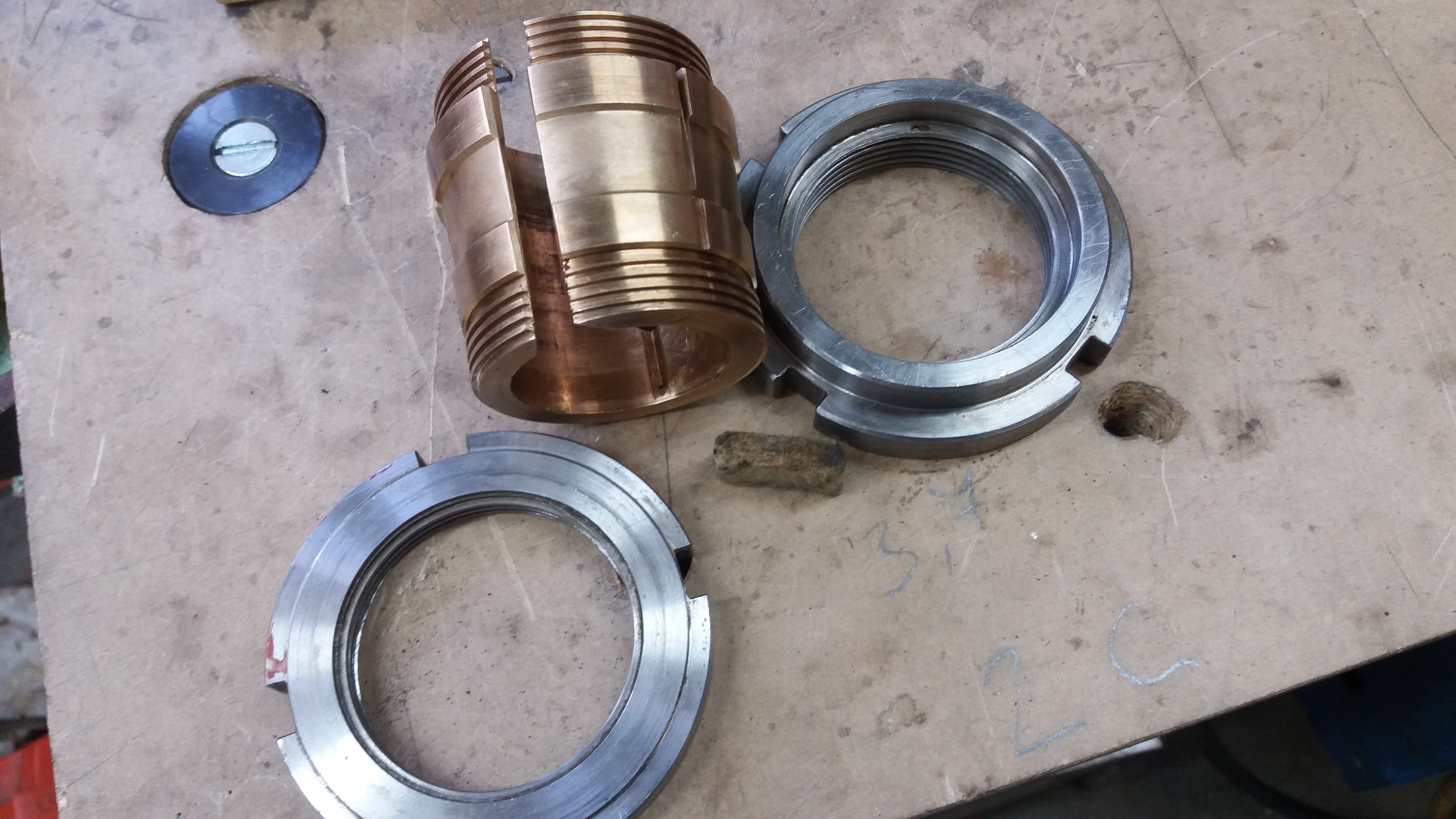 A ještě sem přihodím fotky uložení vřetene, toto je větší z pouzder s matkami. Byla s tím celkem potíž, nemohl jsem je seřídit - když jsem je poladil, tak se mi po chvilce provozu kously. Pak jsem pochopil, že závity v klínkách, které pouzdro rozpínají jsou strhané a pouzdro se proto vždy zdánlivě rozeplo, ale když klínek spadl sevřelo hřídel a bylo... Klínky mám už nové a zdá se že to bude chodit. Pouzdra jsem vyčistil a byl jsem překvapený, kolik bordelu kolem nich bylo, ta kapsa, která je ve vřeteníku a do které si sahá mazací filc pro olej byla plná hnusu, to by si filc nic hezkého nenasál.