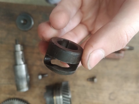 Ještě přikládám pár fotek vřeteníku. K tomu mám otázku: vidlice, která posunuje kolo zubové spojky má vsazené dva kameny, drží tam na šroubech, které nemají na konci závit - tedy, jsou stažené do jakéhosi čepu. Poloha této vidlice se ovládá vytahovací pákou na vřeteníku. V mém přípafdě nedochází vždy k jistému rozpojení spojky - zubové kola nejdou dostatečně daleko od sebe. Moje otázka tedy zní, mají být kameny symetrické, tedy, je na nich díra pro čep uprostřed? Nevím zda jsou u mé mašiny origo, nebo to někdo dodělával. Na spodní fotce je to dobře vidět. Jo a nenechte se plést ppr trubkou, kterou jsem tam vrazil místo vřetene aby mi kola pro fotku držela kde mají :roll: