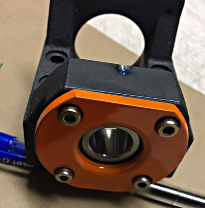 Montážní prostory v mé nové mašince jsou poněkud skoupé, a tak jsem NEMA34 nahradil NEMA23. Sehnal jsem krásný 3f closed loop motor, píšou long a má 4,9Nm a dýlku 150mm. Ovšem NEMA 23 se mi vejde ke šroubu souose a tak nebudu muset dělat řemenice. Ještě ke všemu mám tři držáky SYK MBA12C a tam tu souosost mezi motorem a ložiskem mají v několika tisícovkách. Samotnej držák je krásnej kousek opracované litiny. Malá problémak je to MBA12C, což značí 12mm díru v ložisku a já mám Hiwina s opracováním na 15mm. Nakonec jsem použil samostatné dvouřadé ložisko 3202 a zakomponoval ho do držáku nafest. Udělat dostatečně tuhé a přesné futro se sílou stěny 0,5mm byla pro mě docela hoňka a na třetí pokus. Železo ne, mosaz už vůbec ne a na závěr tedy litina. (OBI redukce 5/4 na coul, pozink cena 27 korun) Ve výsledku kvalitní litina bez kazů, docela fest tvrdá, ale plátkem na litinu to šlo nádherně. Finální opracování jsem dělal v kleštině, abych vymezil nepřesnost univerzálky. Futro lisované a lepené, ložisko jeno namáčklé. Venkovní příruba je z mohutné podložky. Tady mě překvapilo, že použitý materiál není určitě "žádná hlína".