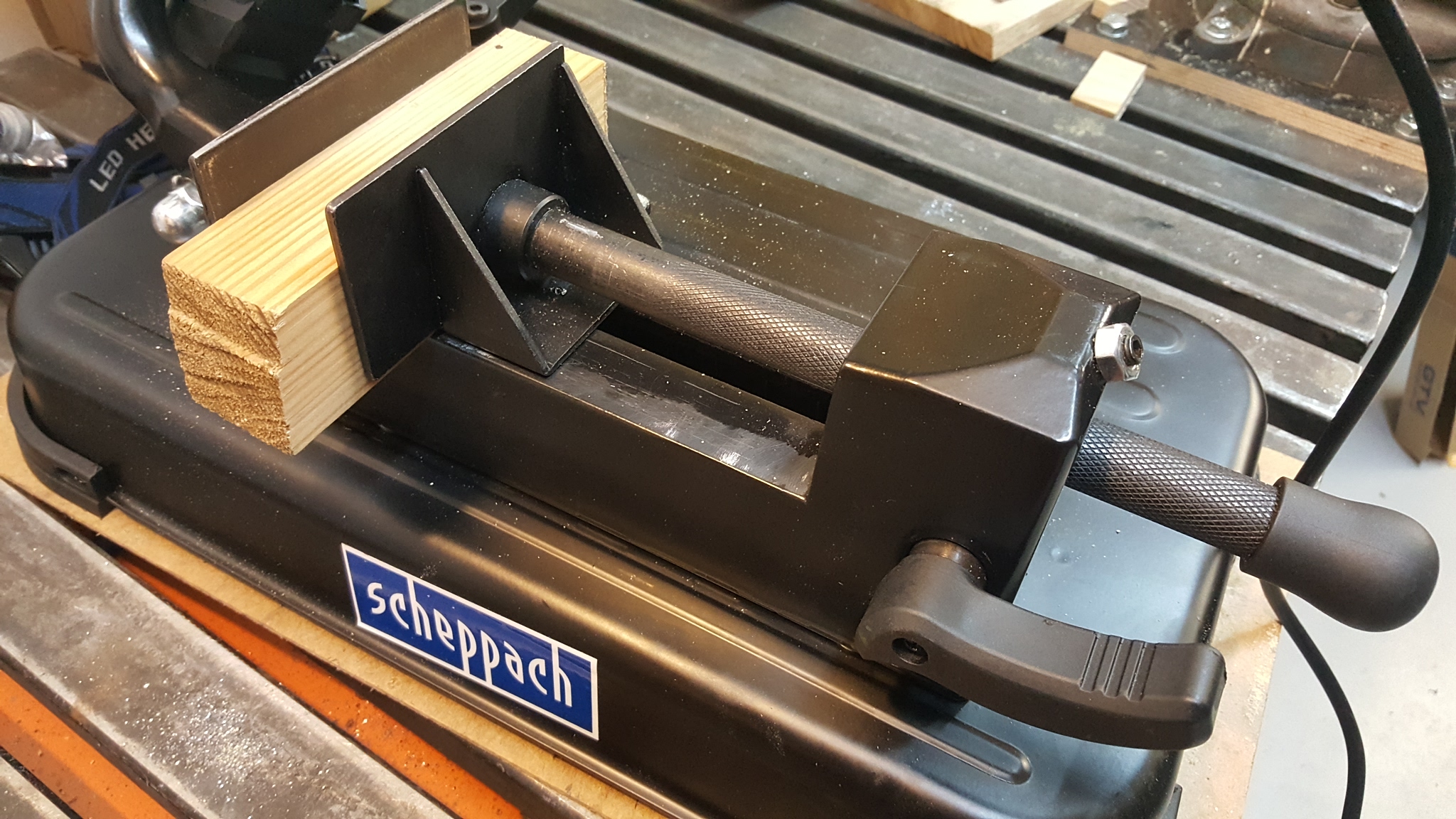 Ľavú stranu zveráka som podložil podložkami 1mm aby sa dosiala vertikálna kolmosť rezu. Posuvná čelusť zveráka má tendenciu sa nadvihovať. Čiastočne to vyriešila šrubka s podložkou zospodu zveráka. Keby som mal frézu, funkčné plochy by som prerovnal.