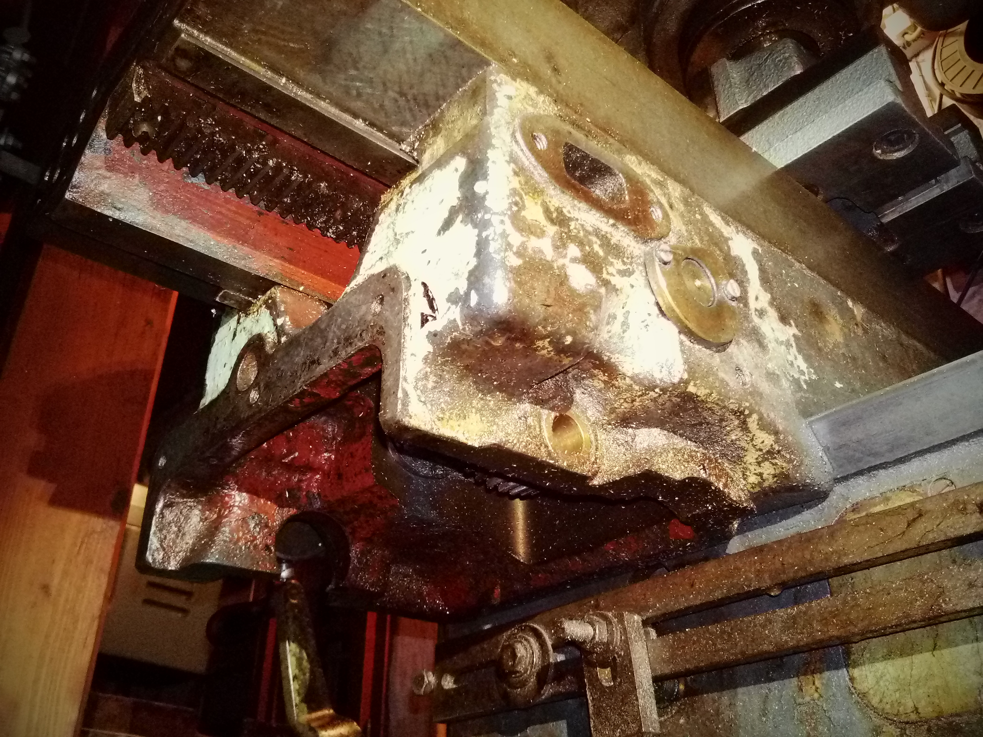 Uvažuji správně, že hřebeny pro pohyb stolů musí pryč a je potřeba tam vrátit trapézy ? Pod horní plochou řemenicí je volná řemenička na klínový řemen, ten šel škvírou naboku do (chybějící) převodovky a odtud kardanem pod stůl. Potud dobrý, ale jak je řešený náhon trapézového šroubu ? Podle všeho se šroub hýbal se stolem a matka byla napevno v těle příčného stolu.