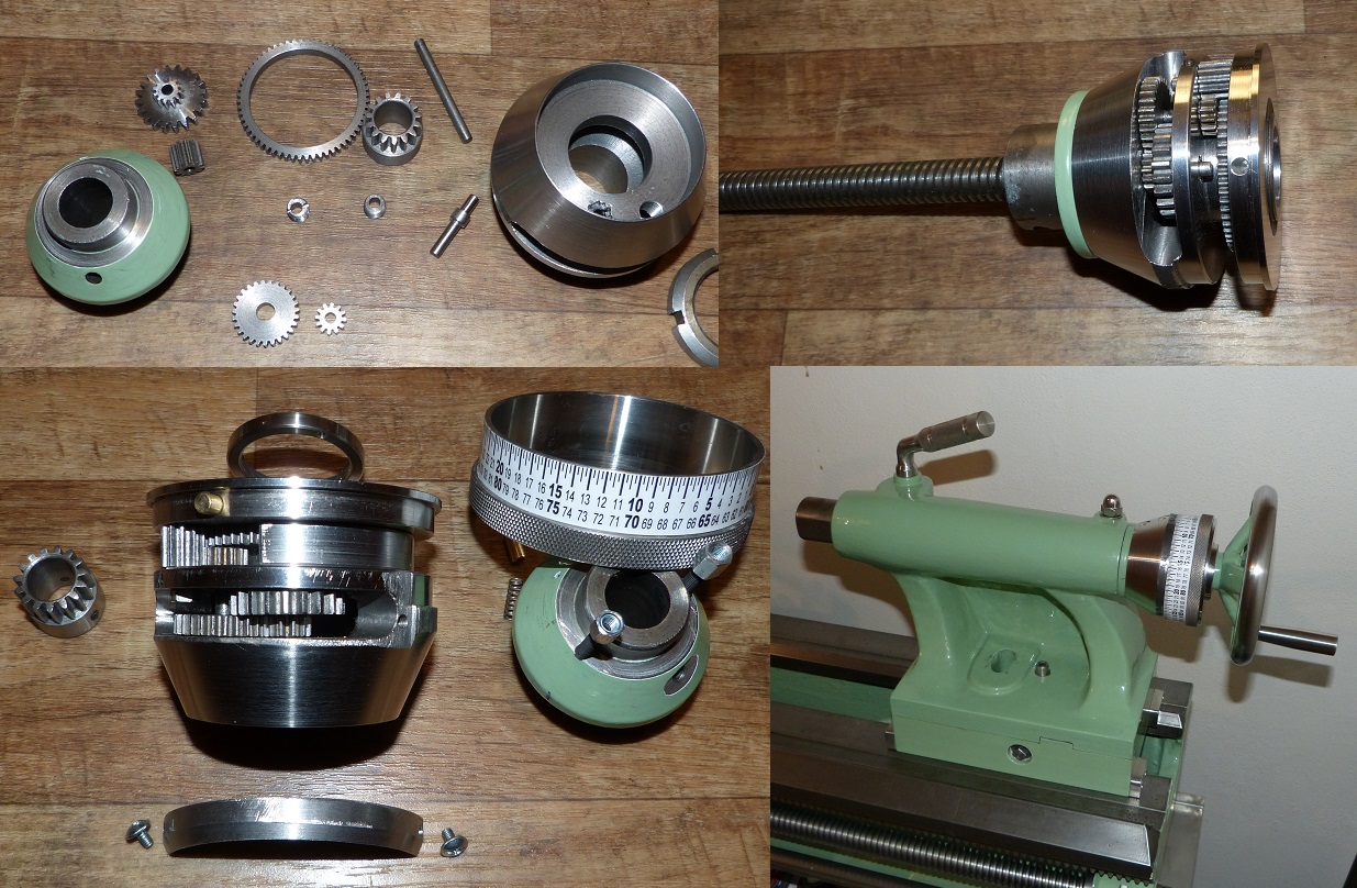 Díky! Pustil jsem se do koníka. Vnitřek opravím až bude tento soustruh v hromadě, potřebuji k tomu rovnější a delší lože než co mám doma na jiném soustruhu. Pinolu už nějakou mám tak tu pak jen dopasuji. Jelikož budu dávat nový šroub s maticí, tak jsem chtěl nějaký nonius. Uvažoval jsem nejprve o posuvce, pak o stupnici na pinole, no a postupným vývojem jsem došel k noniusu, který potřebuji. Při stoupání šroubu 4mm a otočení kličkou - trap. šroubem 15x dokola, se mi otočí nonius 1x dokola tj. na zatím papírové stupnici 60mm, takže 2x dokola nonius tj. 30x dokola kličkou a jsem na 120mm, což je max. výsuv pinoly koníka. Je to taková převodovka složená z běžně dostupných ozub. kol M1 a M1,5. Jinak pouzdra jsou s jemným závitem, mají vyosený otvor a po vymezení vůle mezi ozub.koly jsou dané na Loctite 243 a zaklepnuté důlčíkem...