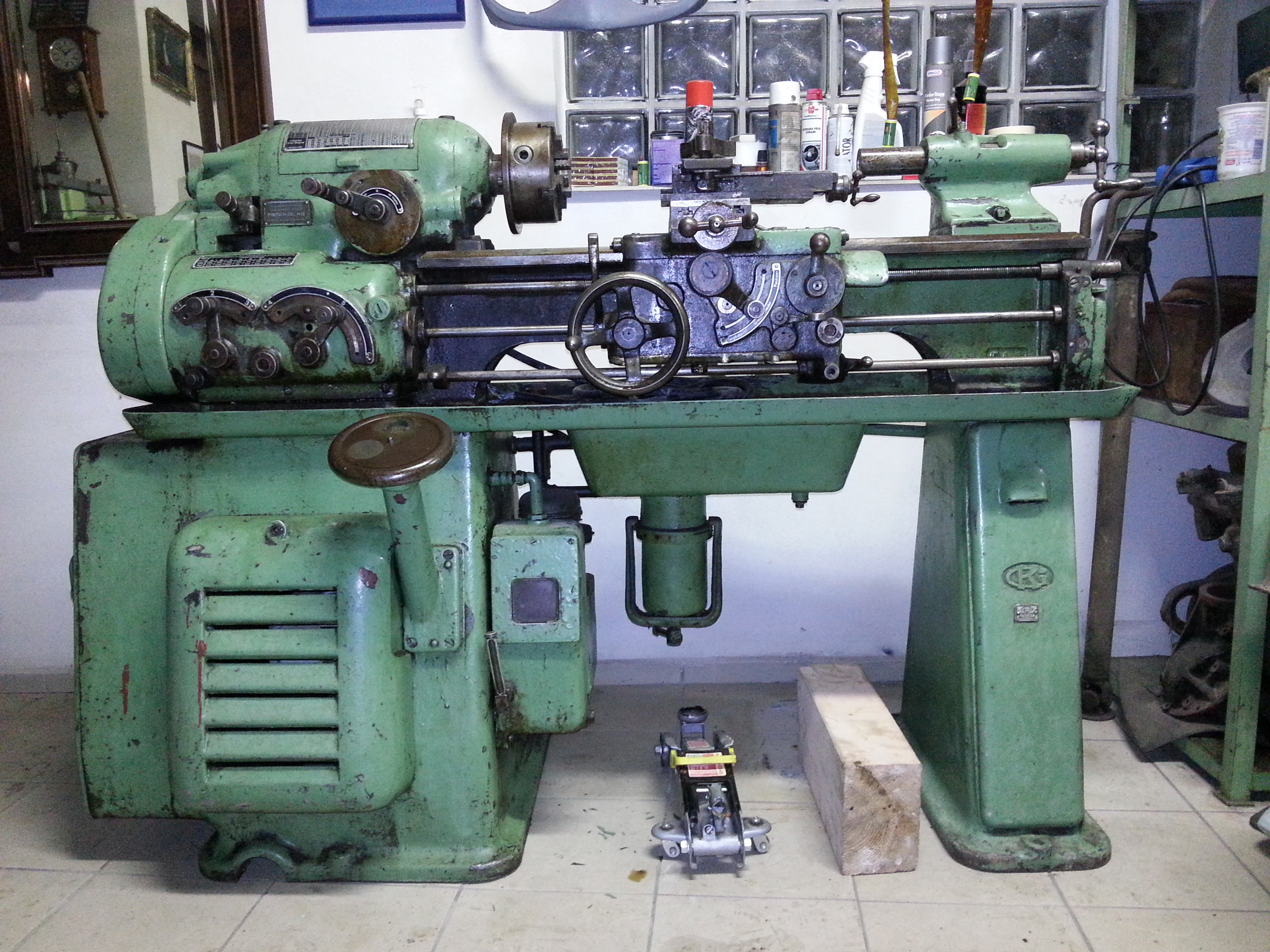 Je to maly soustruh Karger DL1 z konce 30. let. V soucasnosti neni funkcni a to hlavne kvuli nezapojenemu el. motoru a celkove zanedbanemu stavu: spina, zatuhle posuvy suportu a pod. Asi by se po zapojeni do elektriky rozbehl, ale ani to nechci zkouset, kvuli vyse pospanemu celkovemu zapraseni.