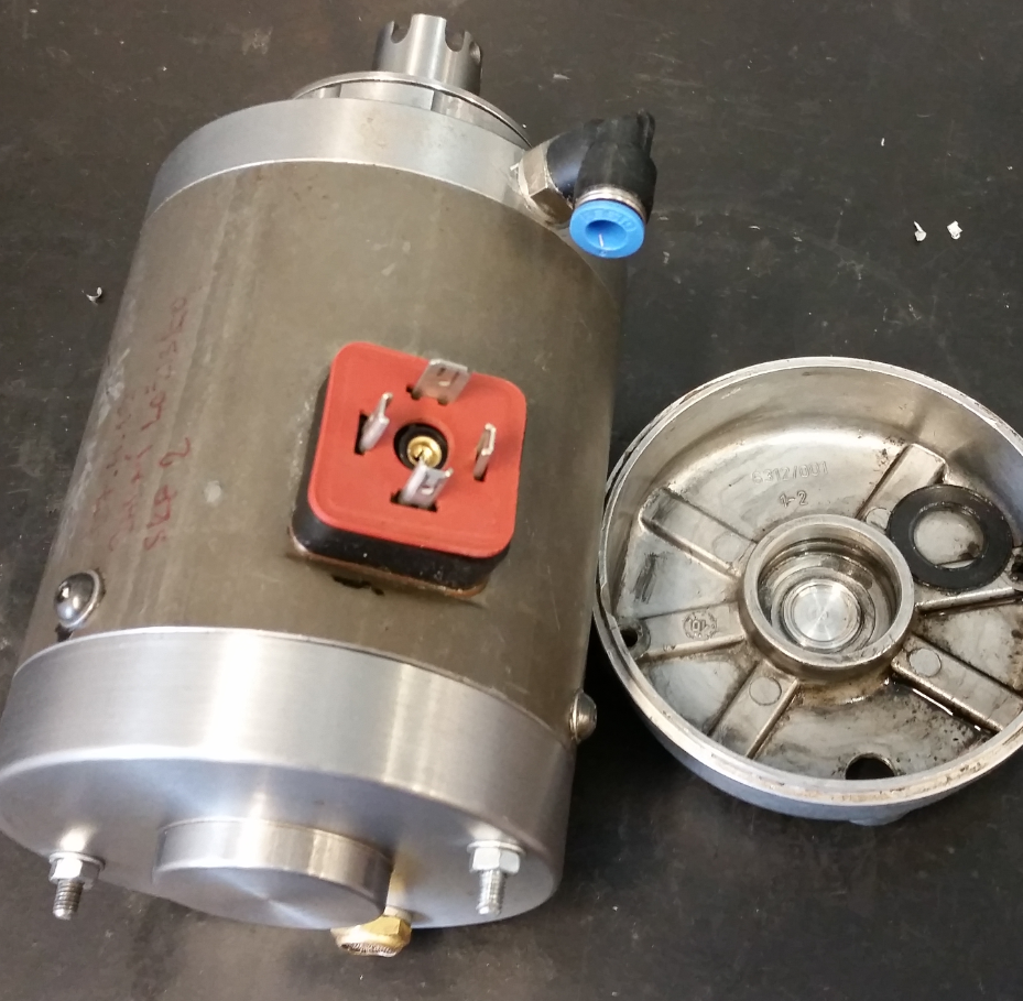 O funkčnosti vrtulky jsem měl pochyby vždycky ale když na motor cáká voda a lepí se Al špony pozbývá smyslu úplně. Navíc vrtulky se po nějakém čase stejně uvolnily a postupně jsme je vyhodili včetně toho krytu. Motory kupodivu přestály vlhkost uvnitř jenom s estetickými nedostatky. Žádný neshořel ! Proto jsem do předního víka navrtal závit G1/8 a našrouboval tam fitinku Festo. Do zadního víka jsem udělal záslepku a uřízl kus hřídele co na ní byla vrtulka. Do nálitku jsem umístil výfuk. Do motoru je přiváděn tlakový vzduch v množství malém (stačil by kompresor z ledničky). Tím se motor i pozoruhodně dobře chladí takže bylo možné zvýšit výkon. S tím tlakováním pozor - je nutné tam dát redukční ventil a pojistný ventil !!!!!