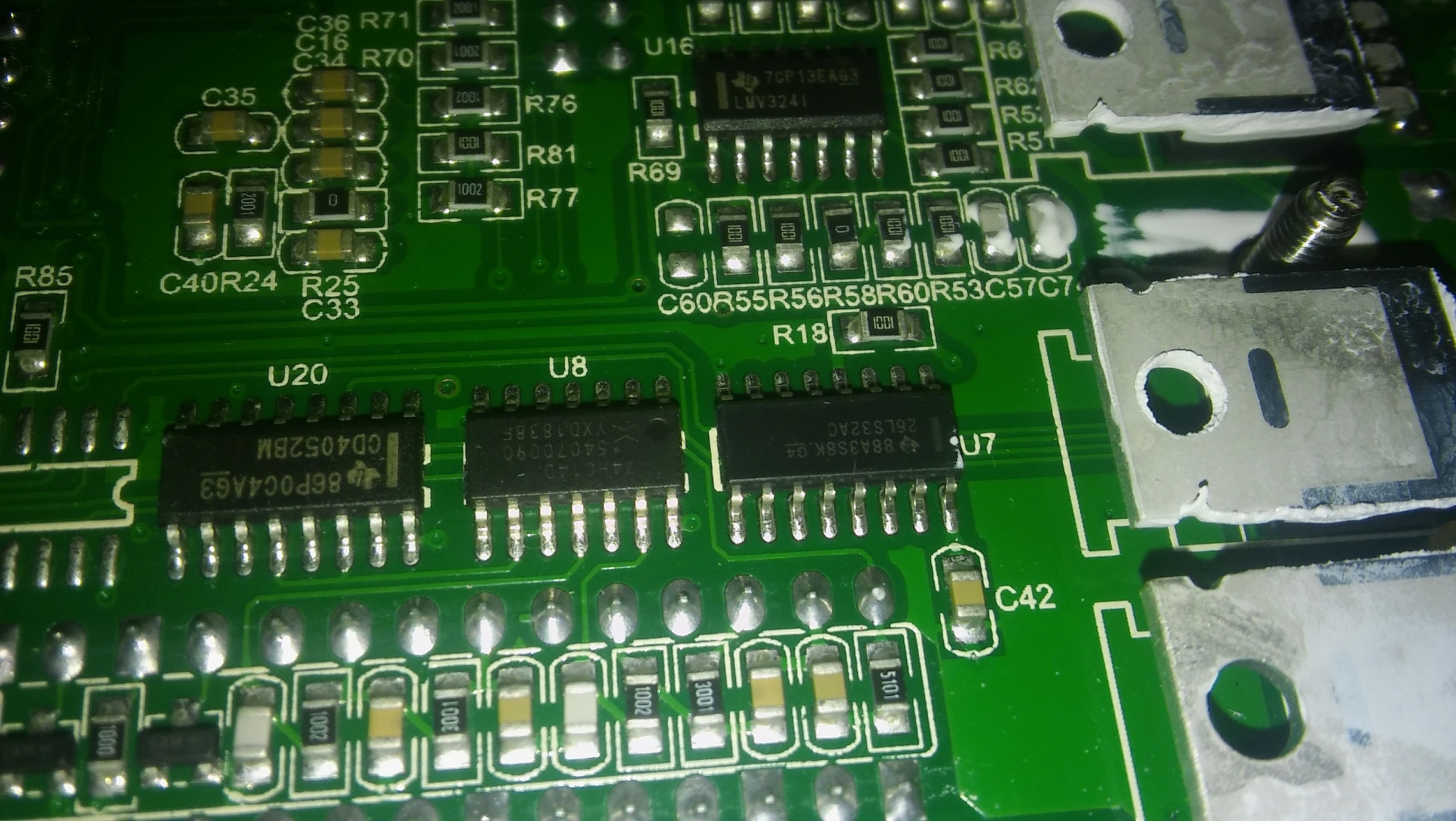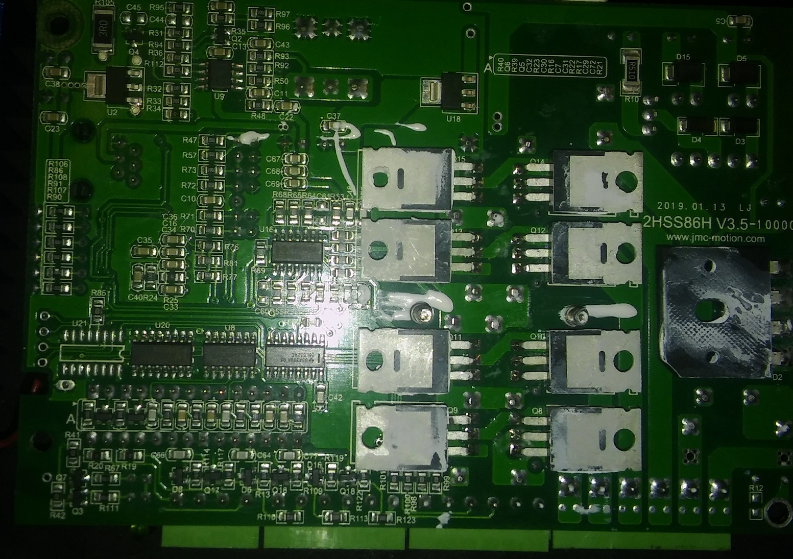Nic moc zvlastniho, klasicke optrony 6N137, neznackove elyty, ale 8ks FETu je original IRF640N od Int.Rectifier. Ridi to DPS TMS320. Jsou tam slusne udelane ochrany vstupu, srazeci vykonove odpory, clamping externima Schottkynama, dale varistory, TVS. Jo a cele PCB ma conformal coating, to se jen tak nevidi!