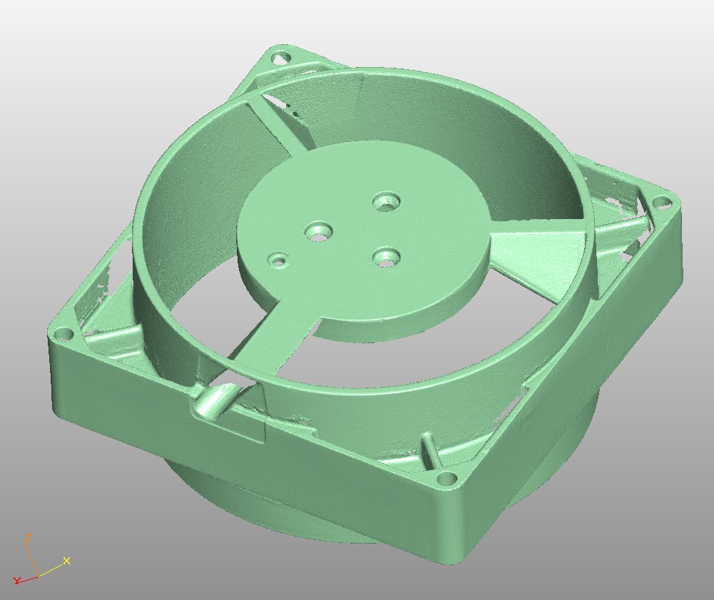 Ten rám má velikost 62x137x137. A výsledná velikost skenu je 180MB. Odhaduji, že na té točně bude možné skenovat díly tak do 80x150x150. Je to skenování skoro bez práce. Sice jsem tu vrtuli a ten rám skenoval skoro hodinu, ale to jsem si hrál s nastavením a spouštěl to několikrát dokola. Do půl hodiny bych se měl vejít. Pokuď jde o větší díly, tak tam se musí dělat jednotlivé snímky v režimu fixního skenu a ručně je napojovat. Což je zdržovačka, ale mělo by se dosáhnout větší přesnosti, než u rychlého ručního skenu.