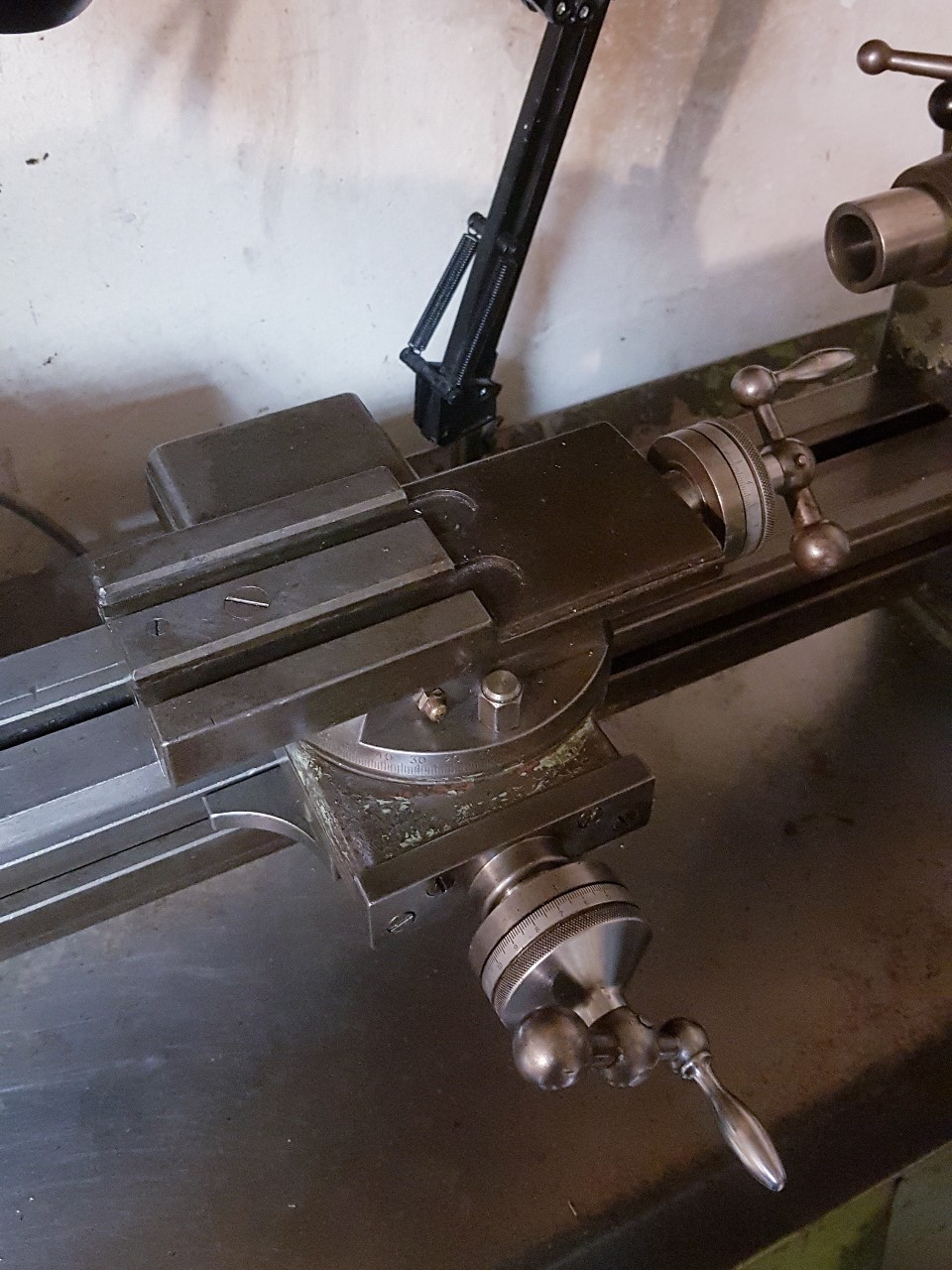 nevím přesně, co jsem koupil, je to takový mix. Habegger byla nebo možná stále je švýcarská firma, která vyráběla soustruhy alá Schaublin, toto je v podstatě kopie Schaublin 102, díly jsou vzájemně kompatibilní, kličkový support a většina mých kleštin je přímo Schaublin. Vřeteno (100 013 v katalogu 1970) má reduktor 1:5, vývrt 20mm, podporu pro kleštiny W20. S nahozeným reduktorem vydávalo strašlivé zvuky, to je teď opraveno (výměna ložiska v řemenici). Koník je také kleštinový (také W20), asi bych raději MK2, ale uvidíme, protože jinak je to docela luxus. QCTP je Tripan 111, mám bohužel jen dva držáky, s tím se bude muset něco udělat.