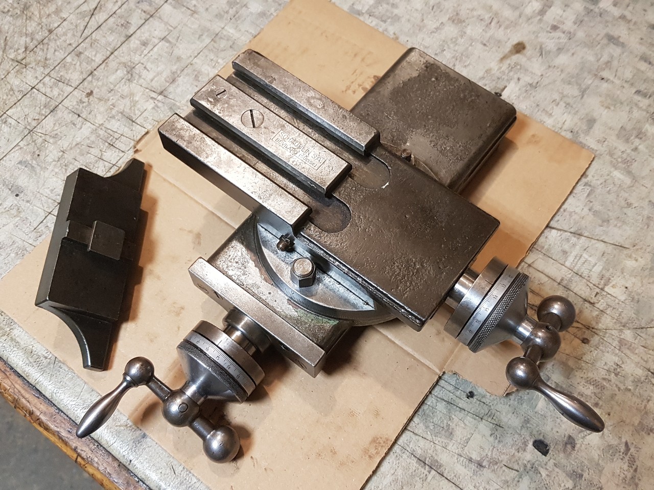 Kromě asi nekompletního podavače k tomu mám navíc dva pákové supporty, jeden jednoduchý a jeden dvouosý. Nevím, co jsou přesně zač, nenašel jsem je zatím v žádném katalogu, ale na lože sedí. Přemýšlím, jestli by ten dvouosý časem nešel upravit pro jednoduchý CNC režim, má to rozjezdy 100x80 a je to fest masivní. Případně to za něco vymění. Časem bych se rád dopracoval k frézovacímu přípravku.