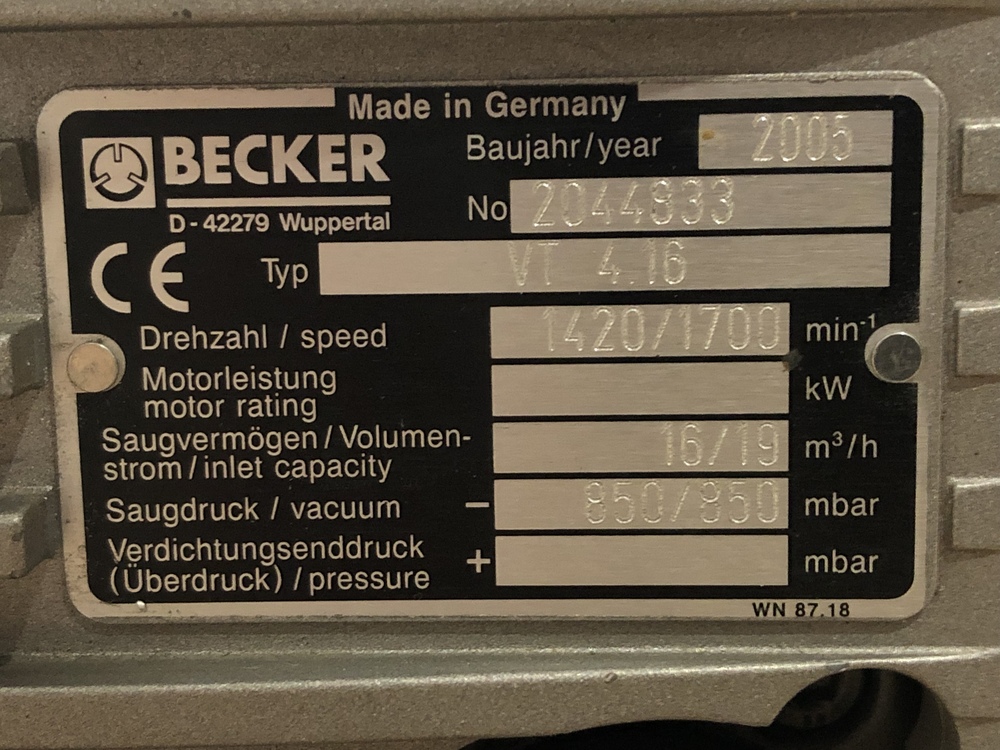 Prodám použitou a plně funkční vývěvu Becker VT 4.16. Jedná se o bezolejovou rotační vývěvu s grafitovými lamelami, vzduchem chlazená, filtr pro nasávaný i vyfukovaný vzduch.