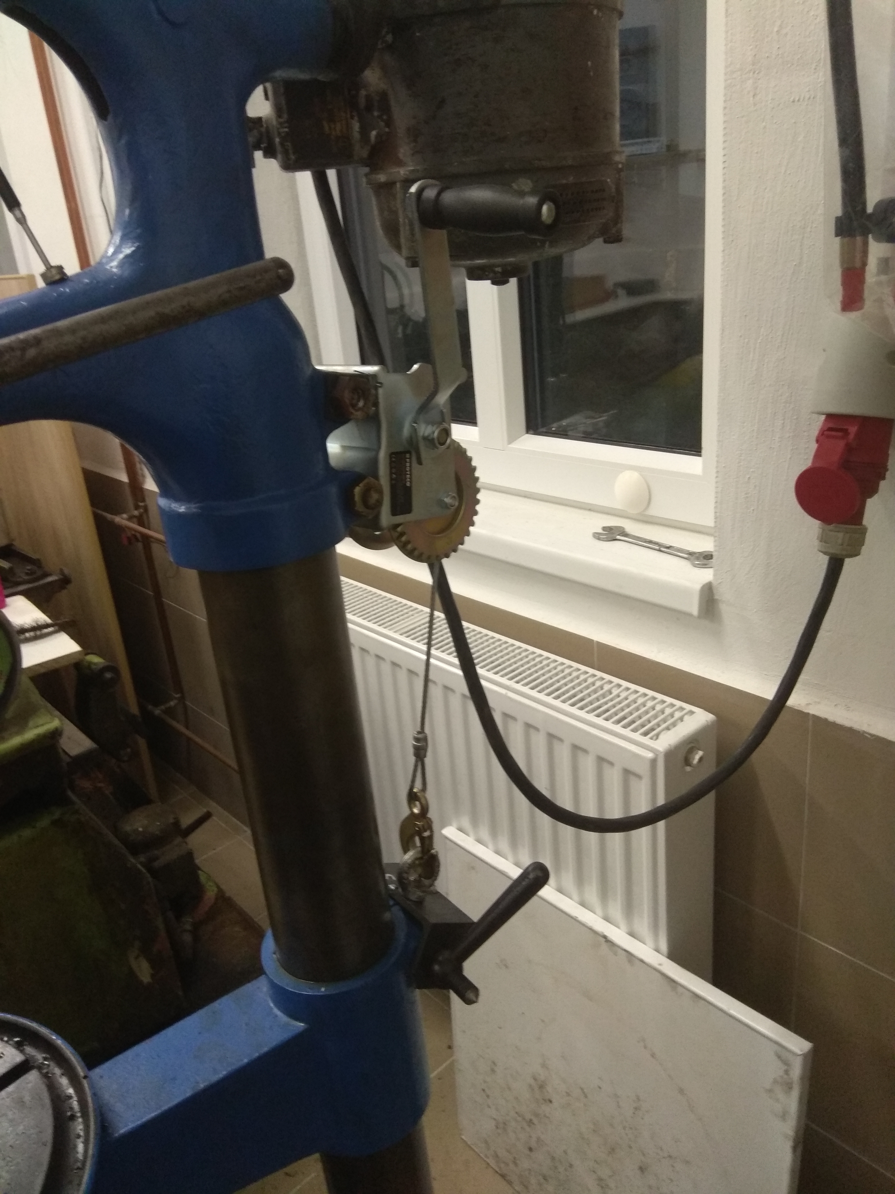 Mam tu samou vrtacku v dilne (snad Volman) pres ty dve kladky jde retizek a pak lanko (cele by to slo resit retizkem) (ten retizek tam pasuje z kola) v noze je zavazi co dovoli vnitrni prumer odhadem 150-200 mm dlouhé.