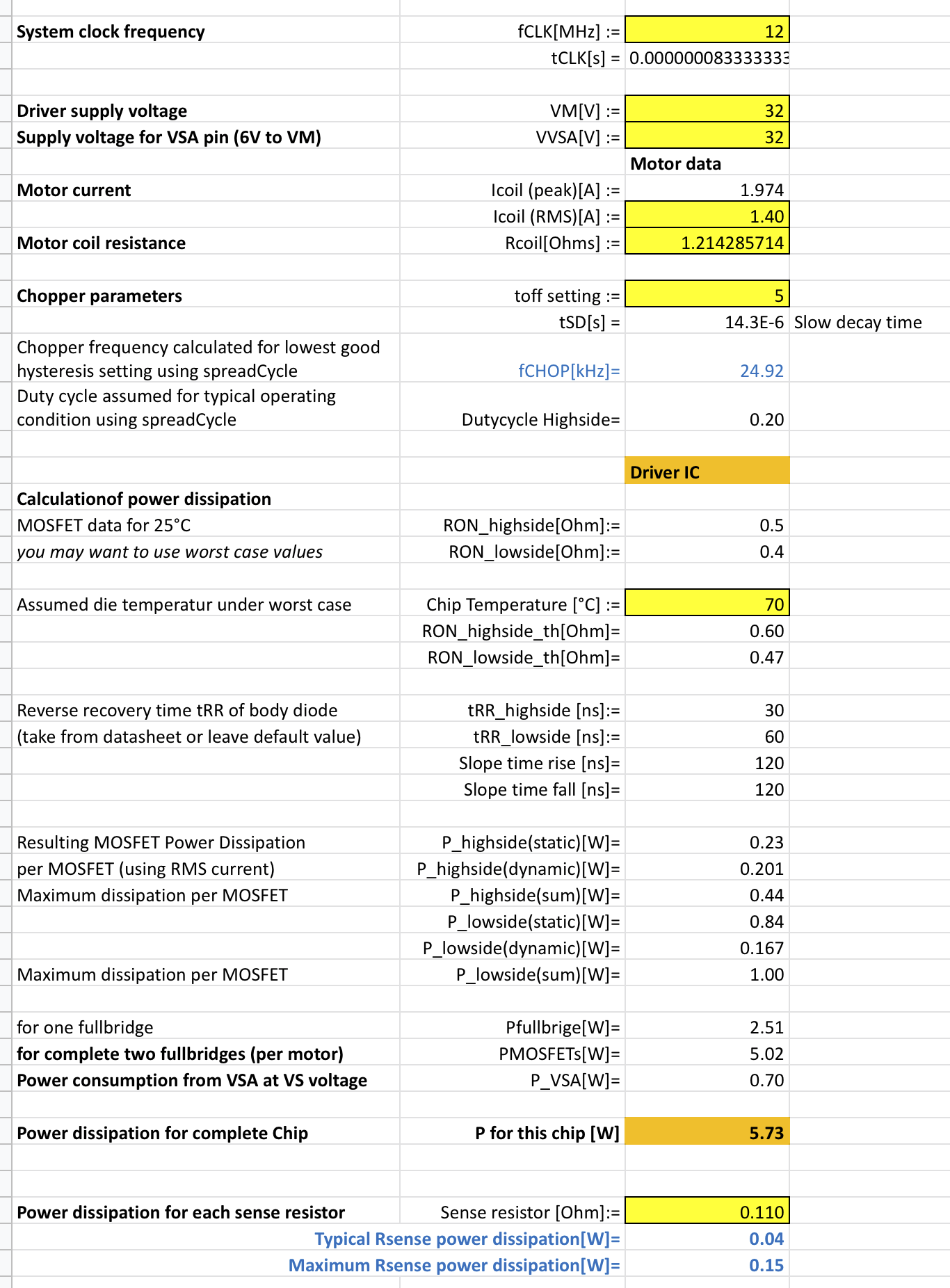 Hmm, tak to je luxusní! Zadal jsem parametry svých motůrků (1.4A / 1.7V, s 1.2A jsem kecal), optimisticky 70°C maximum (dal bych to na pořádný chladič s větrákem, tak snad proboha..) a vychází to 5.7W. 0.7W se dá ubrat externím zdrojem VCC, ale do toho bych se asi nepouštěl (moduly to možná ani neumožňují, nezkoumal jsem). 0.15W na Rsense odporech by asi prošlo, teď ještě na kolik jsou tam ty kondíky, bohužel by klidně mohly být na 25V