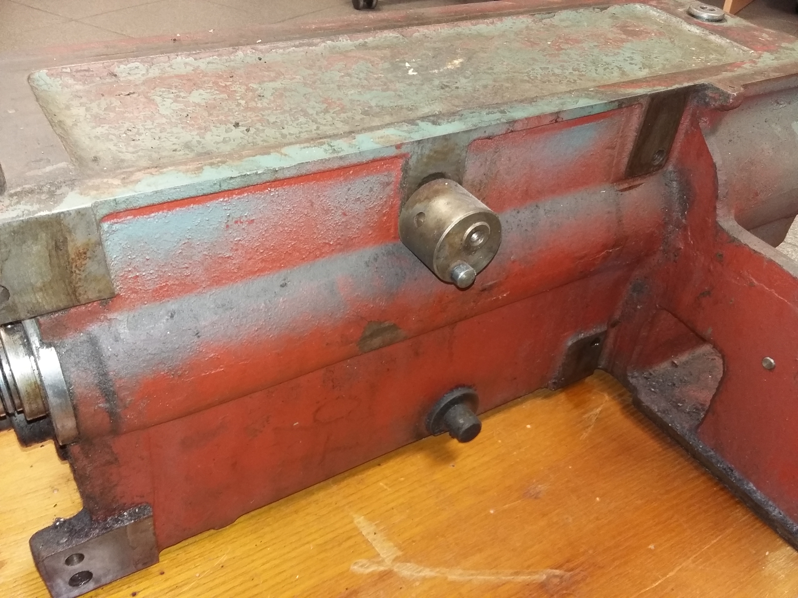 Teď nechci kecat, ale myslím, že nortonku budeš muset sundat. Nejde o šrouby které drží vřeteník, ty jsou přístupné bez sundání, ale z nortonky zezadu vychází táhlo/kolíček které zapadá do vydličky na vřteníku. Je to reverz posuvu. Jen si fakt teď nejsem jistý. Možná že by stačilo vřeteník trochu naklonit.