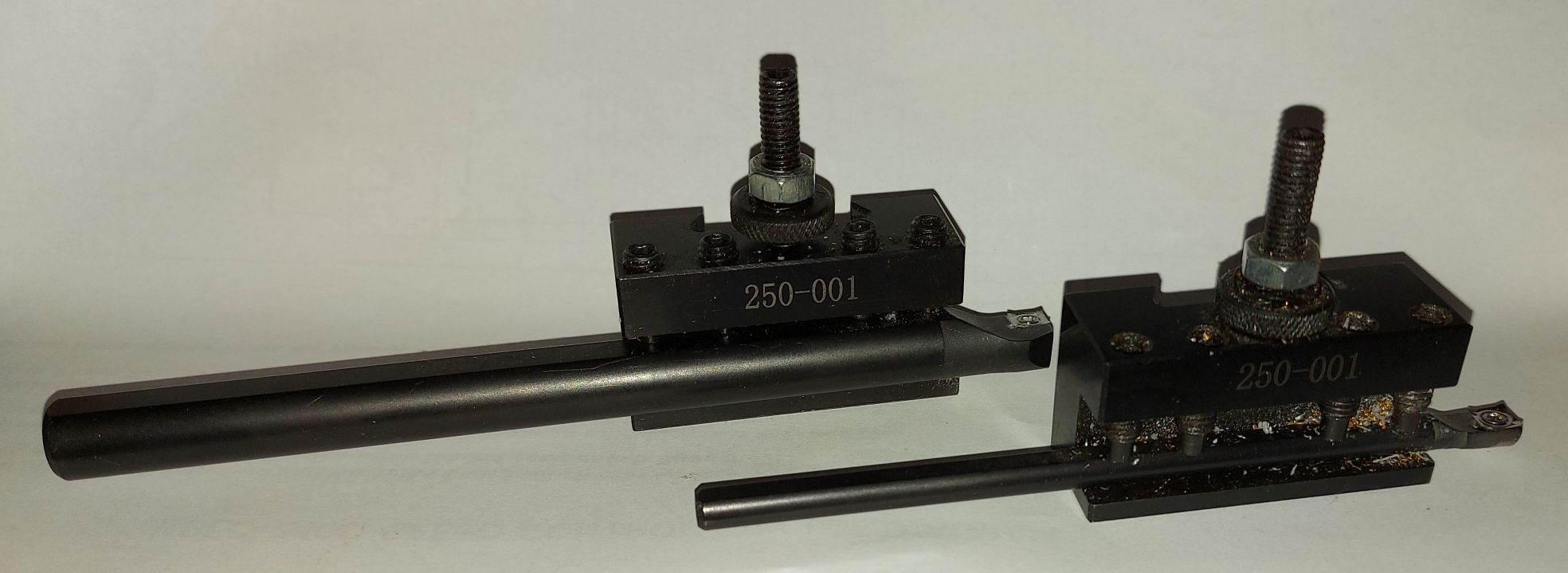 No já jsem i tu díru 12 mm pro nože od vyvrtávací hlavy dělal přímo na soustruhu, takže je přesně v ose hlavy a ty díry 6 mm a 8 mm bych dělal stejně, tak zase váhám mezi díra nebo drážka. Výrobně je jednoznačně snazší díra, jen to bude chtít opravdu hodně přesné díry, aby byl nůž výškově přesně v ose obrobku, když nebude možnost to upravit podložkami...