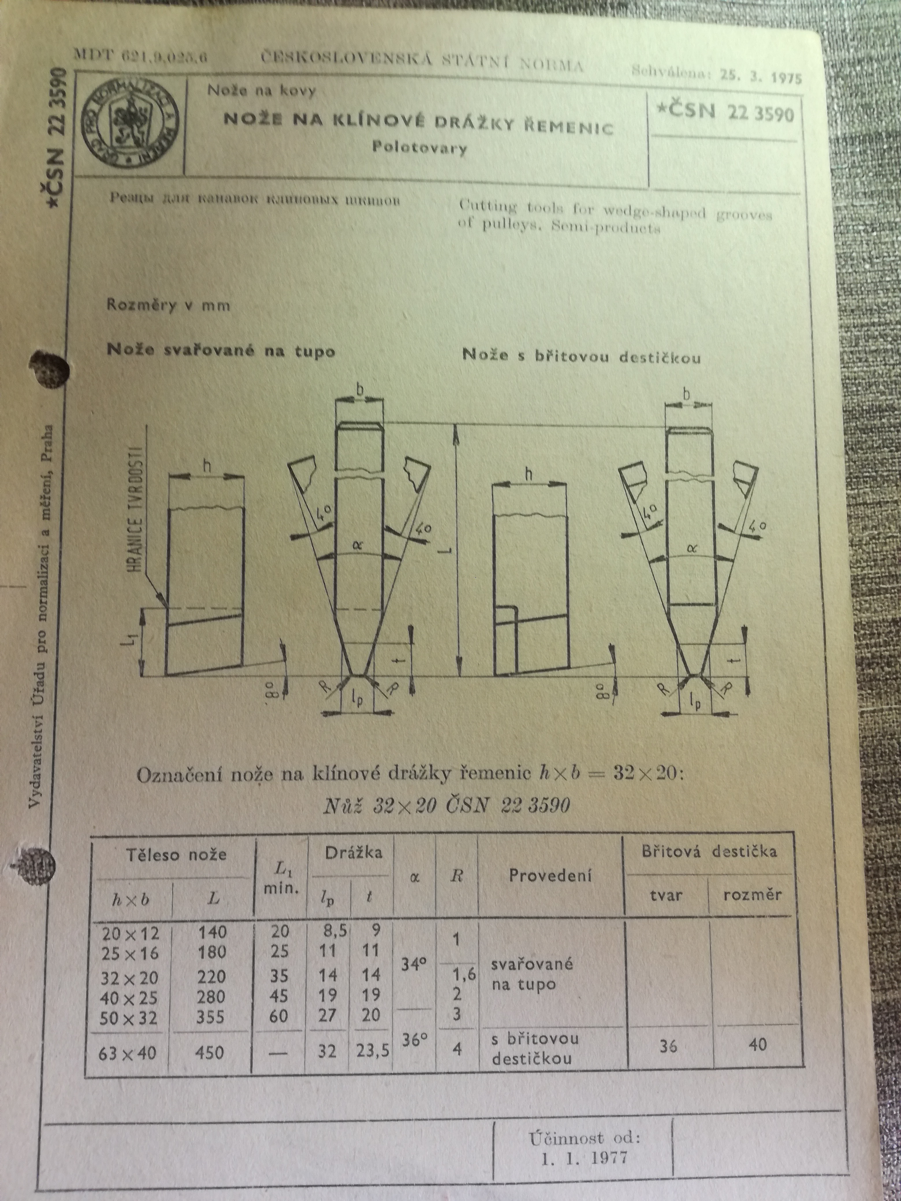 qwer píše: 10. 6. 2020, 8:38 Uhol sa volí podla priemeru remenice- menší priemer= menší uhol. Niekde v tabulkách by si to mal nájsť. Používam nože nabrúsené na uhly 34 a 38°. 003.JPG