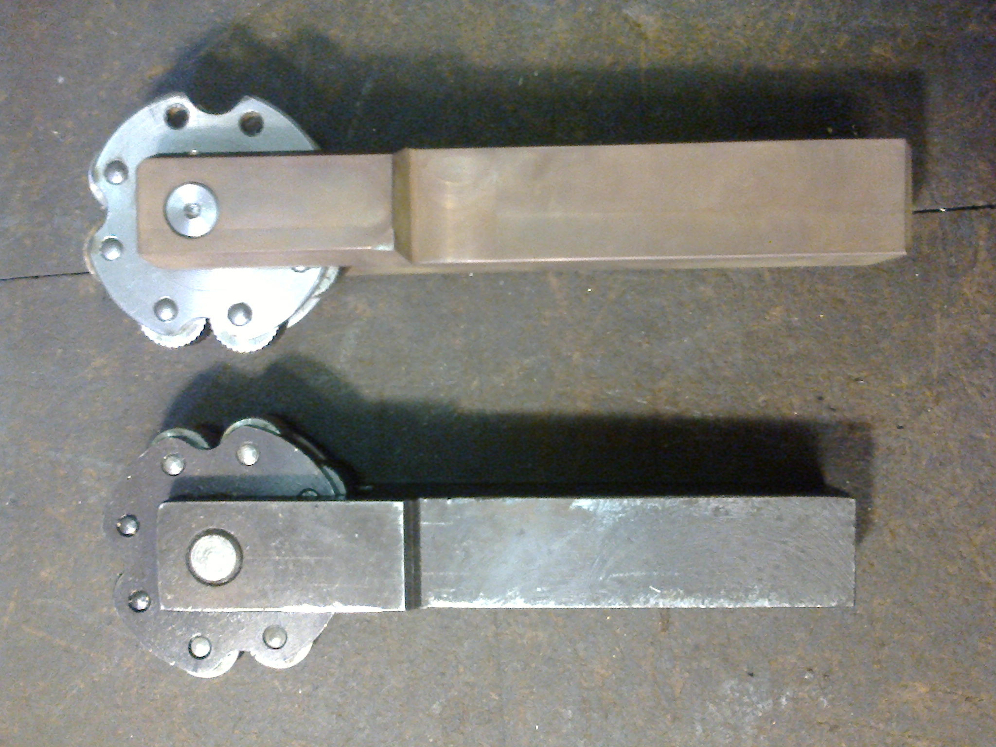 Nebylo do čeho jiného klofat, tak jsem vzal kus 11600, vypíchal o -20mm drážku, zarovnal z obou stran, udělal díru 14 H7,zarovnal povrch upíchnul, vzal 6Hr, orovnal ze 4 stran, na pásovce vyřízl drážku,na frézce zarovnal, atd, atd a mám krásný držák rádlovacích koleček Vlevo je tovární originál :wink: