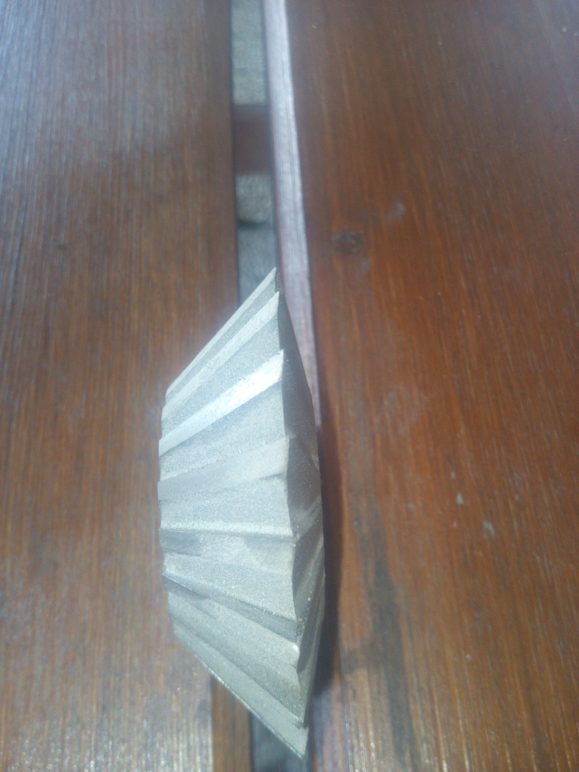 Co by na tom mělo být tajného. Normálně zúhlovat na míry, vyvrtat díru, udělat úhlovou podložku použitelnou jak na zfrézování šikminy 8°a taky pro frézování toho rýhování frézou na závity. Když ji nemáš, tak by se to muselo po jedné drážce úhlovou frézou. Tak jsem to dělal na "dvě patra".