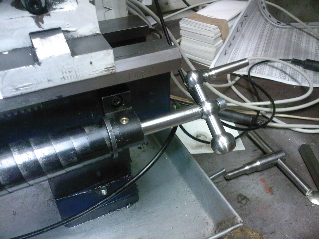 Tak se to blíží k finiši. Jen jeden problém, chtěl jsem udělat na noniusu rysky (dílky) 60ks při stoupání záv.tyče 1,5mm by dílek vycházel na 0,025mm. Zjistil jsem, že stoupání záv.tyče není 1,5mm, ale 1,449mm. Nevěřil jsem tomu a při 10 závitech jsem fakt naměřil 14,49mm. Zapnul jsem aut.posun, ručně točil záv.tyčí a výsledek při 10ti otáčkách fakt 14,49mm. Kde je tedy chyba, je to snad nějaká strojní tolerance, nebo chyba záv.tyče. Tyč je tovární výroby. Měřeno vícero měřítky.