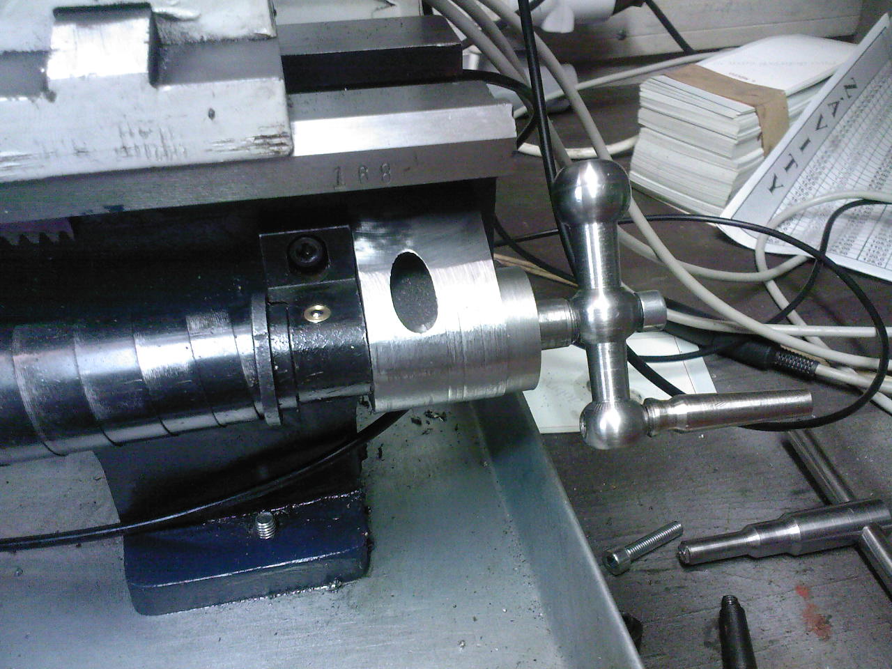 Tak se to blíží k finiši. Jen jeden problém, chtěl jsem udělat na noniusu rysky (dílky) 60ks při stoupání záv.tyče 1,5mm by dílek vycházel na 0,025mm. Zjistil jsem, že stoupání záv.tyče není 1,5mm, ale 1,449mm. Nevěřil jsem tomu a při 10 závitech jsem fakt naměřil 14,49mm. Zapnul jsem aut.posun, ručně točil záv.tyčí a výsledek při 10ti otáčkách fakt 14,49mm. Kde je tedy chyba, je to snad nějaká strojní tolerance, nebo chyba záv.tyče. Tyč je tovární výroby. Měřeno vícero měřítky.
