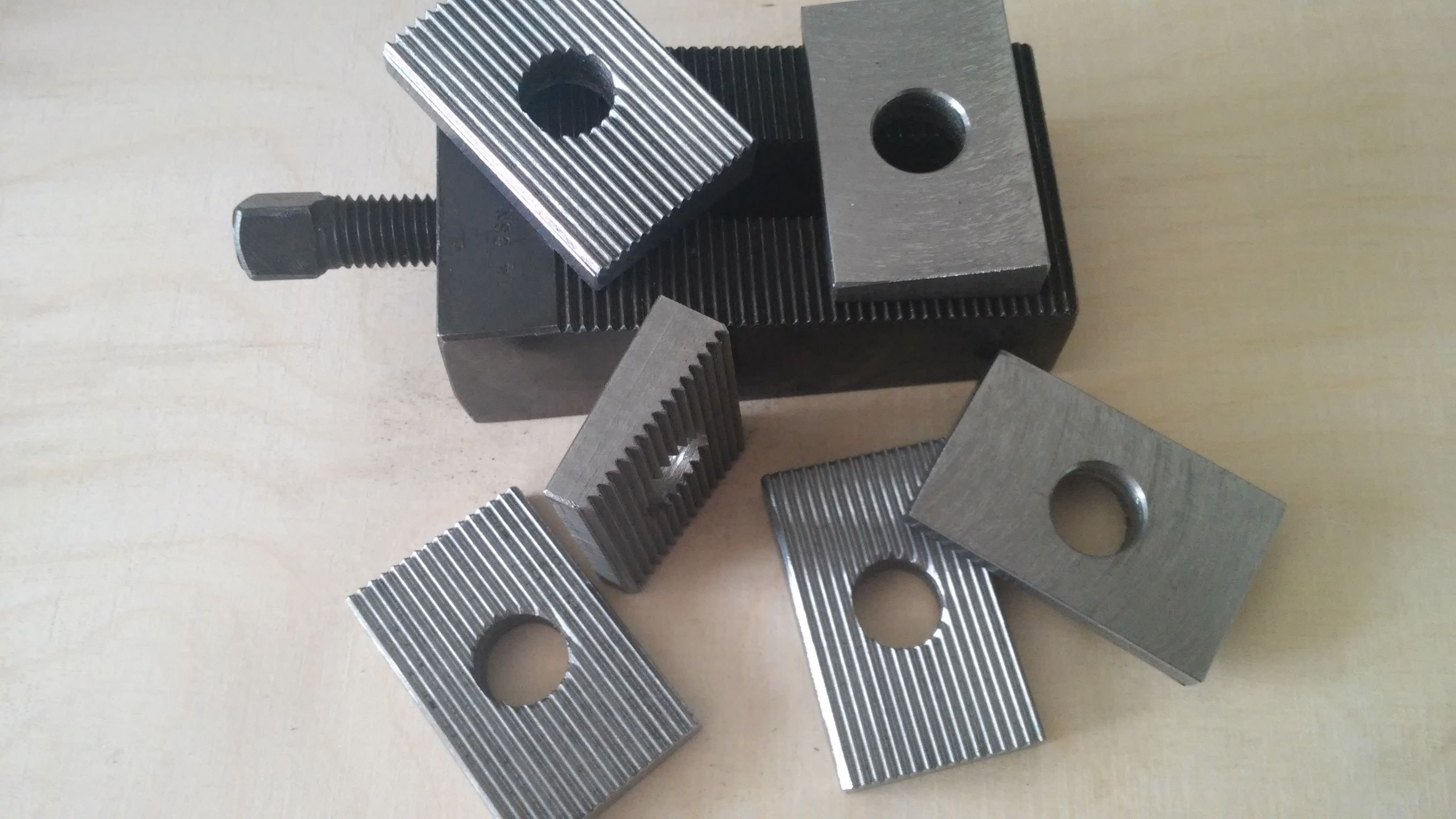 mám tyhle boční upínky pro šrouby M12 z předlistopadové výroby. Mají rozteč drážek 2 mm a vrcholový úhel 60°. Kdysi jsem si na ně dělal příložky pod šrouby z 19 436, nakonec jsem je ani nekalil. K frézování drážkování jsem použil nástrčnou frézu na metrický závit příslušného stoupání. Tyhle frézy nemají zuby ve šroubovici jako odvalovací frézy. Sklon plochy s drážkováním je u mých upínek 8° a osa drážek je na tuto plochu kolmá.