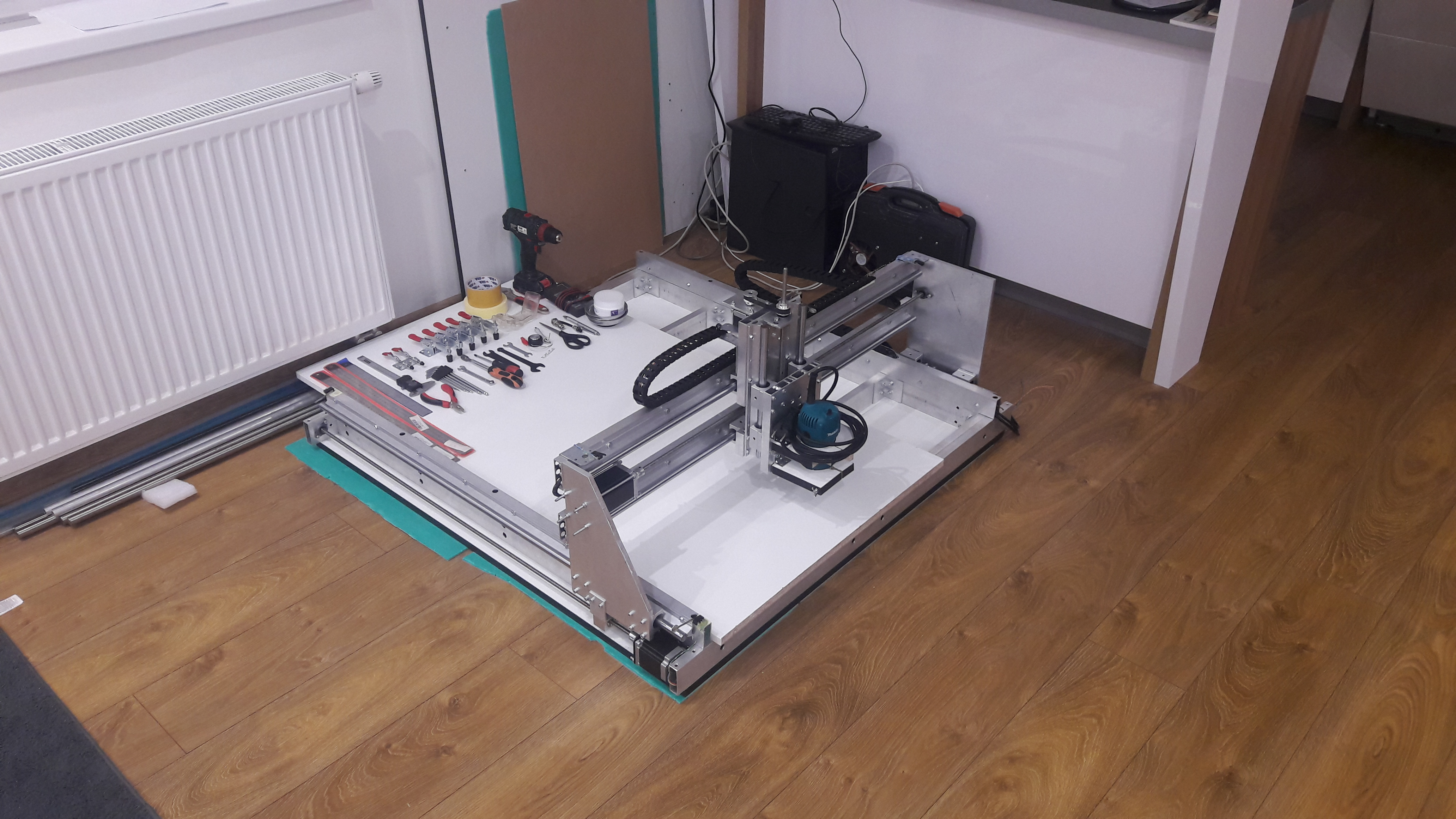 OK, povedal som si, a prihodil som este par drobnosti, ako uchyt na frezu a flexibilne kablove vedenia a zopar drziakov na uchytenie obrabaneho materialu. v cene cca dalsich 70 Eur.