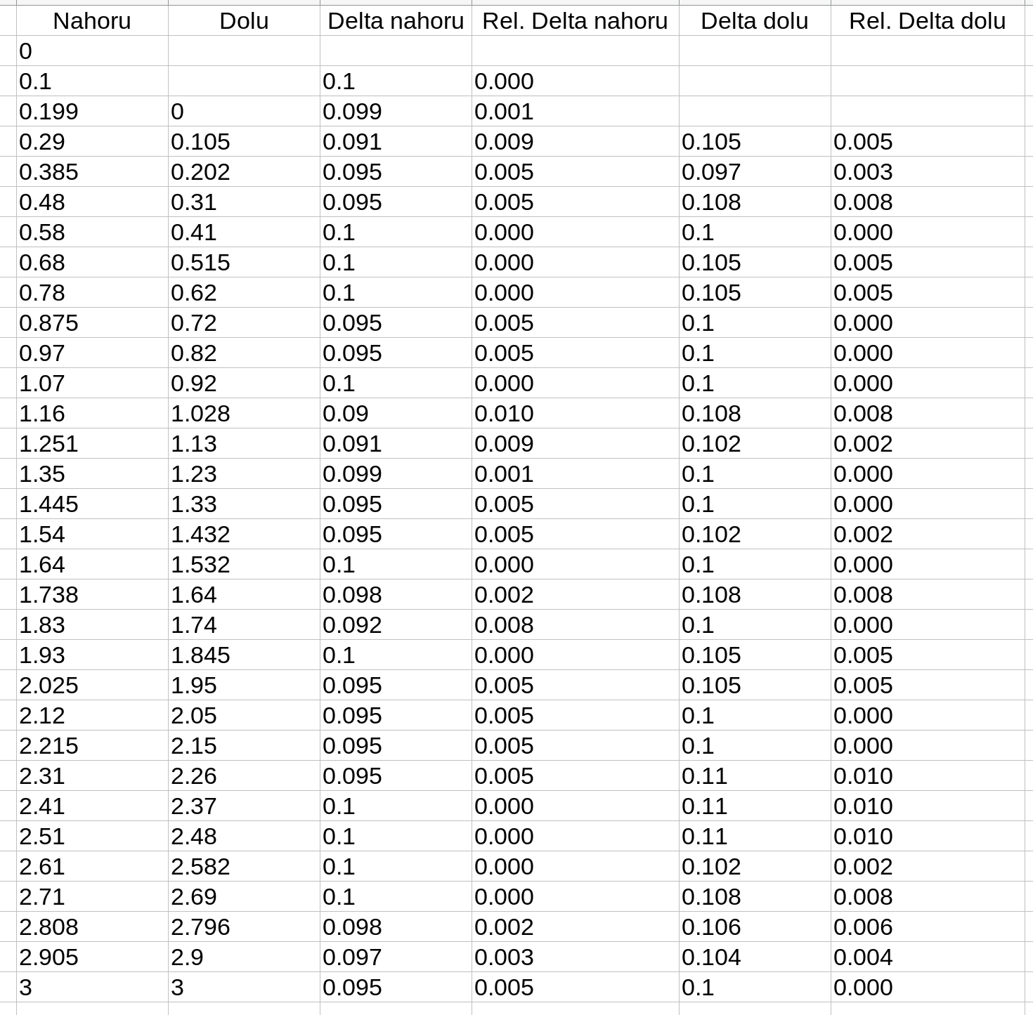 Sloupec nahoru znamena mereni pohybem nahoru proti hodinkam. Dolu bylo od hodinek. Krok pohybu byl 0.1mm. Jelo to 3mm, vic hodinky neumi. Ty delty jsou prepocitane rozdily mezi sousednimi merenimi a pak rel. delta je, o kolik se ten rozdil (v absolutni hodnote) lisi od 0.1mm.