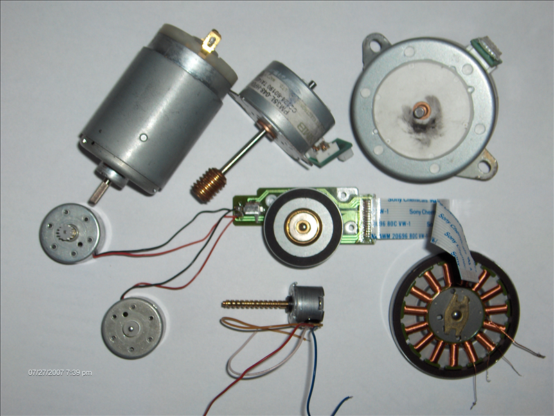 mám doma 8 motorov (na obrazku - 1. a 2. hore sprava su krokove, takisto tie dva vpravo dole a aj to "oko" v strede - z CD mechaniky :-). Su zo starej tlaciarne, alebo z CD a disketovky. V poslednom case sa dost zaujimam o elektrotechniku, najma o mikrokontroléry apod. Myslite, ze by bolo mozne tieto motorceky vyuzit na nejaky pristroj ovladany cez PC (napriklad plotter) ? Vedeli by ste mi poradit nejaku zaujimavu stranku, kde by sa dalo nacerpat viac informacii ?