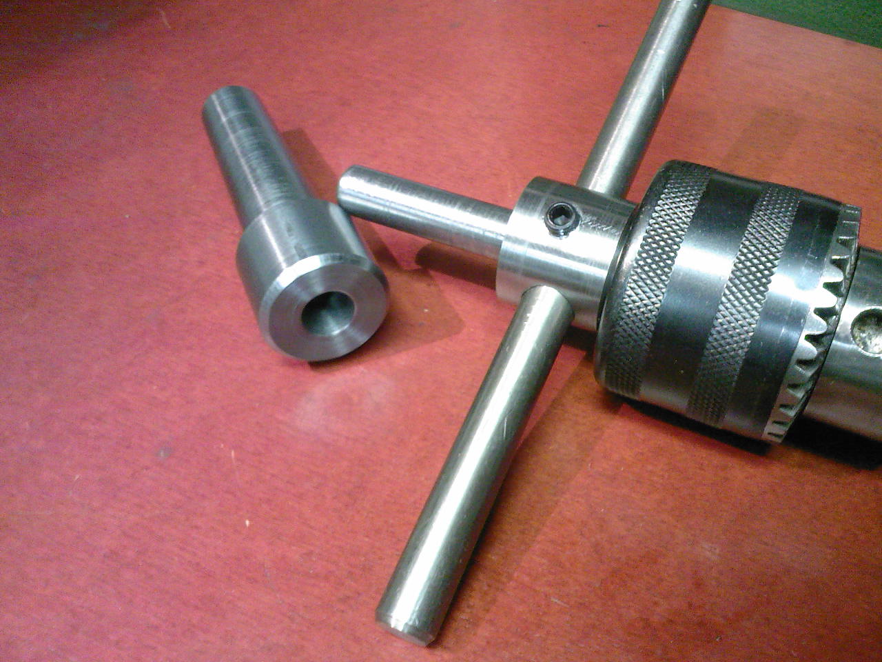 Vzadu na foto je stopka s MT2 kuzelom do konika. Otvor v nej je voditkom pre sklucovadlo so zavitnikom a vonkajsi valcovity priemer sluzi ako voditko pre pripravok so zavitovym ockom (na kazdej strane pripravku iny priemer ocka). Tycky na vratidlo mam len 2 na obidva pripravky, vzdy ich naskrutkujem tam kde treba.