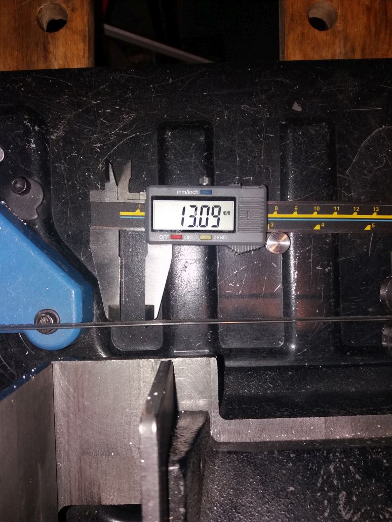 Pás od svěráku cca 13,1 Tak jsem se podíval zespodu jak je svěrák uchycený. Stačilo by převrtat díry blíž k pilovému pásu. Nápad posunout díry o 11 až 12 mm blíž.