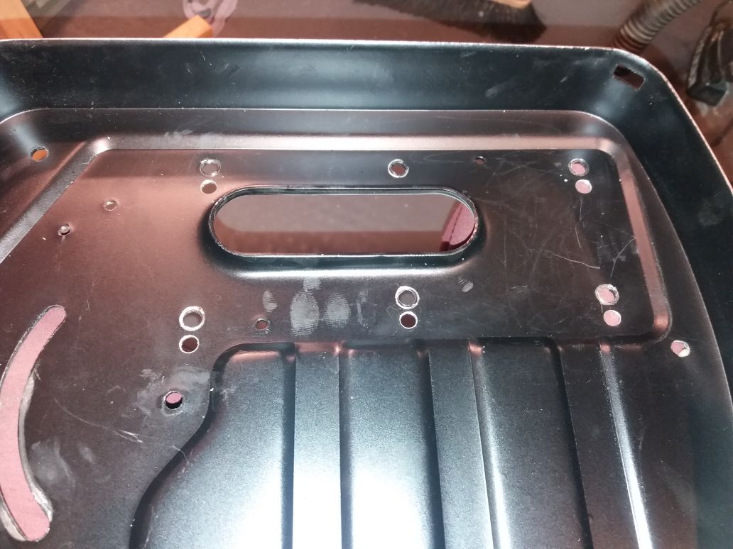 Šup s tím na frézku Vyvrtané otvory - zde sem prostřední zadní nevrtal - vrtání by vyšlo do vylisovaného plechu pod svěrákem - myslím, že uchycení svěráku jen pěti šrouby místo šesti nebude zásadní problém. No a zde je výsledek: Ještě pohled zezadu na posunutí svěráku blíž k pásu.