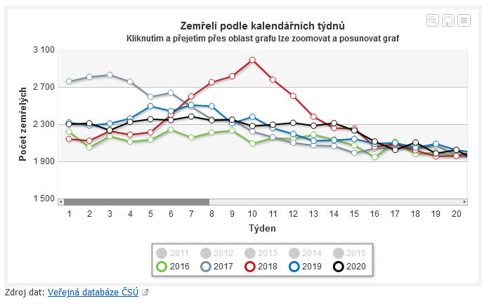 Prohlédni si tento oficiální graf a - pokud budeme srovnávat jen jaro - porovnej 6. až 14. týden roku 2018 se stejnými týdny roku 2020. Rok 2020 zatím jeví z hlediska počtu zemřelých průměrný až podprůměrný.