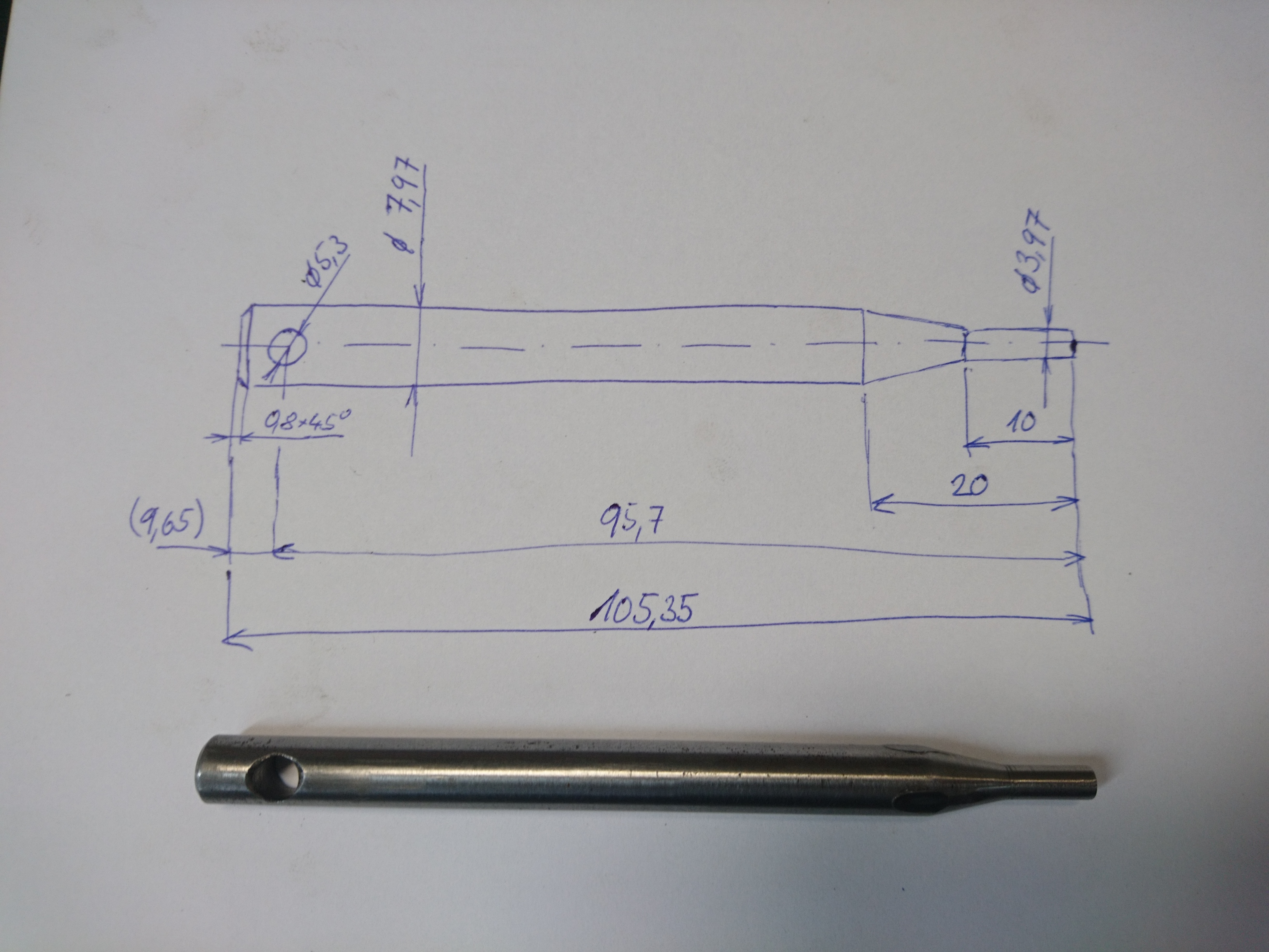 Dneska už se k vidličce nedostanu ale tyčku jsem zkreslil. Doufám že neurazí že píšu přímo míry a nedohledavam odpovídající tolerance. K té tyčce asi jinak není moc co vysvětlovat. Přes díru průměru 5,3 a šroubek je spojena s tím presuvným kroužkem do kterého zabírá vidlička. Na druhé straně tyčky je kužel který vytlačuje ty tři kalené kolíčky které přes trojúhelníkové ramínka spínají spojku. Na mé tyčce jsou už trochu vymačkane žlábky od těch klíčků.