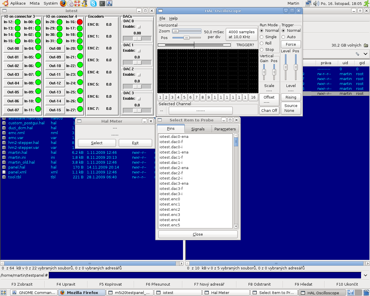 Spuštením programu m5i20testpanel_startup se na obrazovce objeví iotestpanel a dále se otevře halmetr a halscope jako v emc a vše běží v realtime.