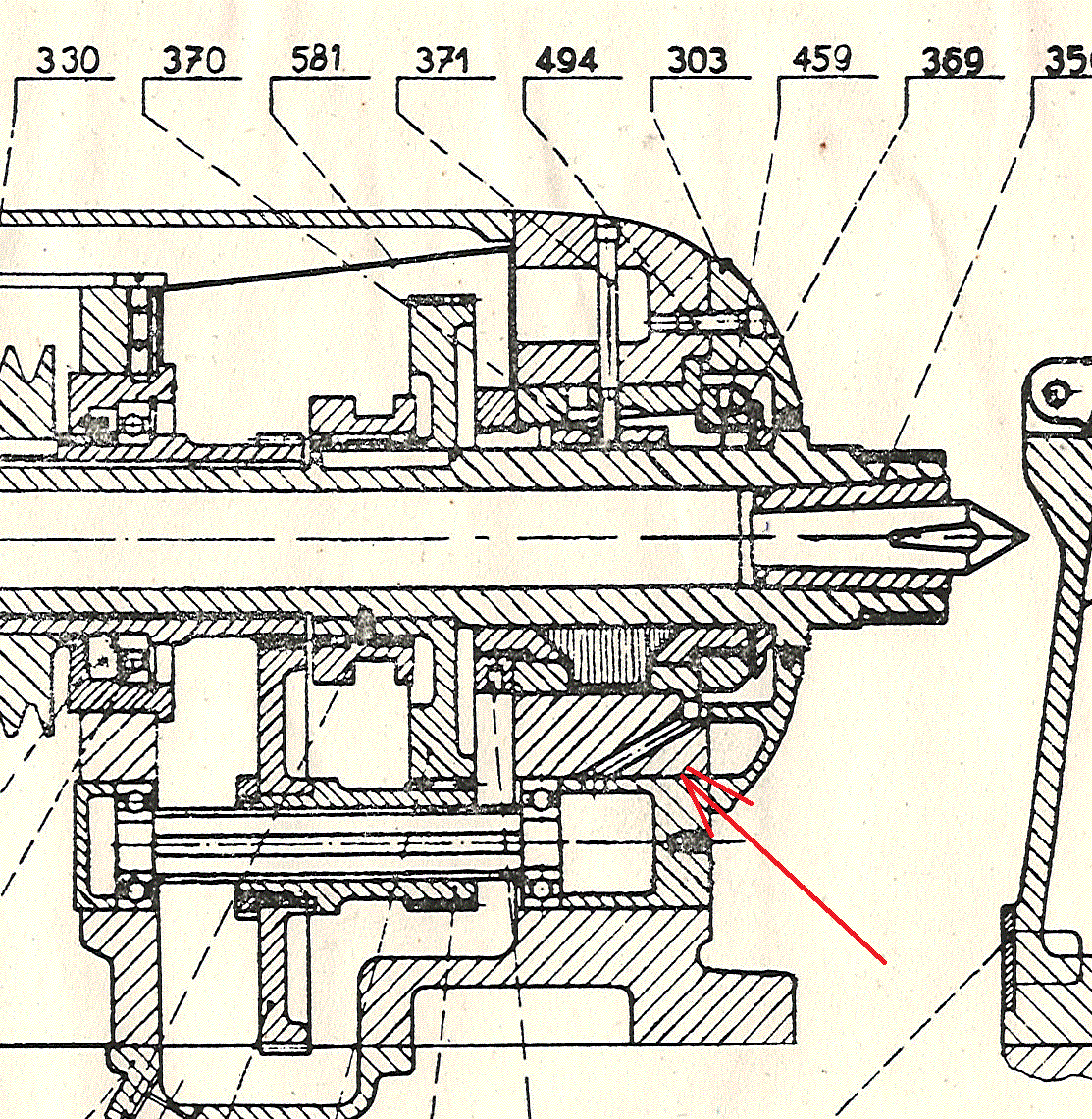 je tam ostřikový kroužek a v předním deklu nejvýše plstěný kroužek. Zkus pročistit odtokový kanálek, na obrázku označen šipkou. Někdy je na vině přílišný přívod oleje do předního ložiska, to se řídí škrticím šroubkem na přítokové trubce oleje uvnitř vřeteníku. Olej má být přiváděn do ložiska v takovém množství, aby byl jeho přítok pozorovatelný v okénku vřeteníkového olejoznaku. A.