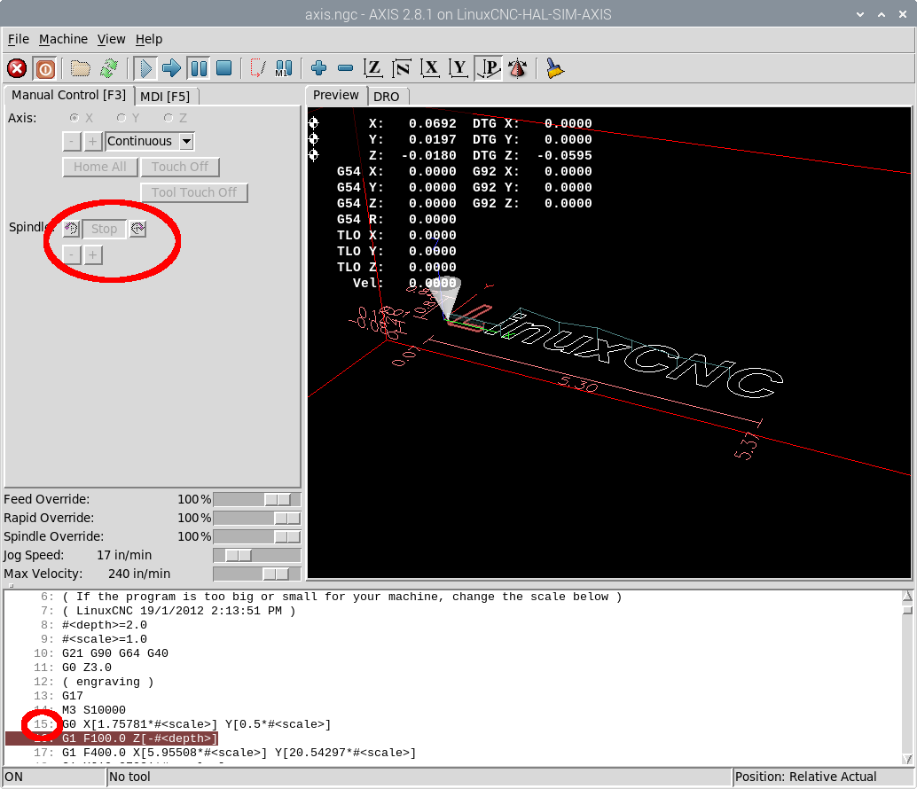 Pokud byste byli ochotní, tak bych Vás poprosil udělat jednoduchý test, otevřete si LCNC, zajeďte s vřetenem někam do bezpečného prostoru, načíst nějaký G-kód a spustit jej třeba od půlku. Zajímá mě zda se roztočí vřeteno, či ne.