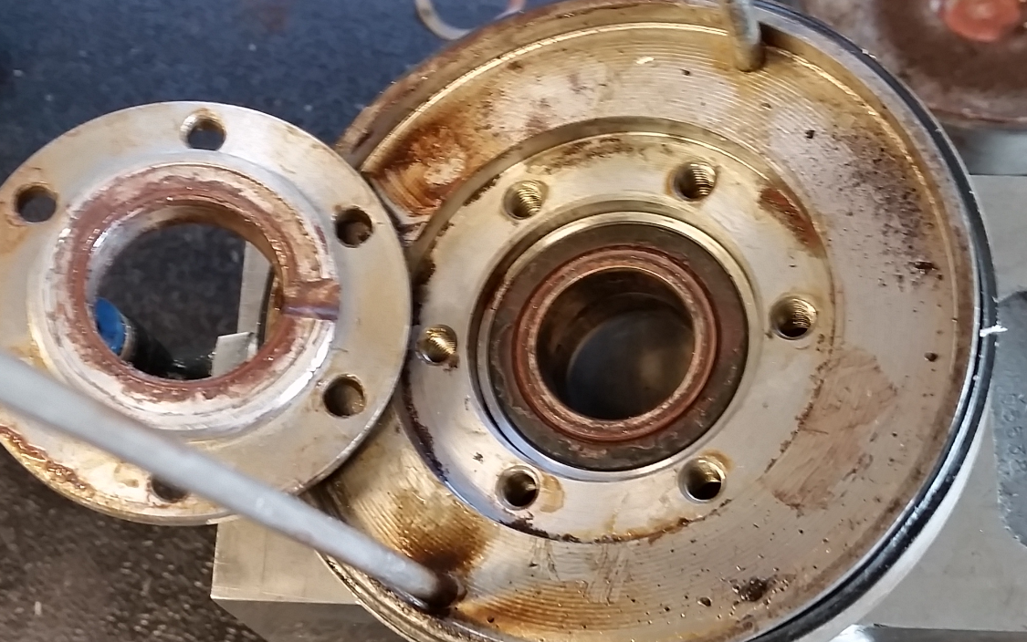 Fréza pr 10 tříbřitá - tvarová, chlazená emulzí. Na motoru byly vrstvičky sanytru od zaschlé emulze. Motor se točil ale bylo cítit že ložiska jsou KO. Po rozebrání jsem zjistil, že je zcela zadřené zadní ložisko a všude jsou stopy tlakové koroze // taková ta rezatá špína //. Zadní ložisko se protáčelo na hřídeli a zcela ji zničilo. Přední ložiska byla kupodivu v docela dobré kondici i když musela dostat "za uši" od uvolněného zadního ložiska. Po otevření krytu v nich bylo mazivo a zřejmě by ještě něco naběhala. Brzdicí O kroužek zadního ložiska byl ztvrdlý a zralý na výměnu Vlnovcová podložka byla odřená a také na výměnu Po konzultaci se zákazníkem jsem rotor vyměnil za jiný - použitý ale bezvadný. Při montáži je nutné všechny šroubové spoje pojistit lepidlem Zadní ložisko je předepínáno vlnovcovou pružinou a bržděno O kroužkem. Musí se axiálně posouvat aby vyrovnalo tepelnou roztažnost a předepínalo zadní ložisko. Je nutné lůžko ložiska namazat vazelínou shodnou s vazelínou ložiska aby nedošlo ke kontaminaci. Při montáži se nesmí do ničeho ťukat ani použít násilí. Na závit matice ER16 je dobré použít protizadírací pastu // nejen při opravě //. Záběh začínám asi na 60 Hz - 15 min FW - 15 min REV - 5 min pauza. Pak pokračuji až na cílovou frekvenci viz doporučení výrobců ložisek. Záběh trvá cca 5 hod !!! Tento Atas je jeden z nejstarších v provozu // má ještě menší rozteč šroubů příruby // a je myslím potřetí na "generálce". Ložiska nyní stála 2424CZK přední // 2 kusy // a 1378CZK zadní // jedno //. Za tu novou hřídel jsem zákazníkovi naúčtoval 1500CZK. Rozborka, vyčištění, drobný materiál // těsnění , O kroužky, odmašťovače a spojovák // montáž a záběh jsem zákazníkovi účtoval 2000CZK. Celá generálka tedy stála 9726, což je cca jedna 7hod směna práce stroje.