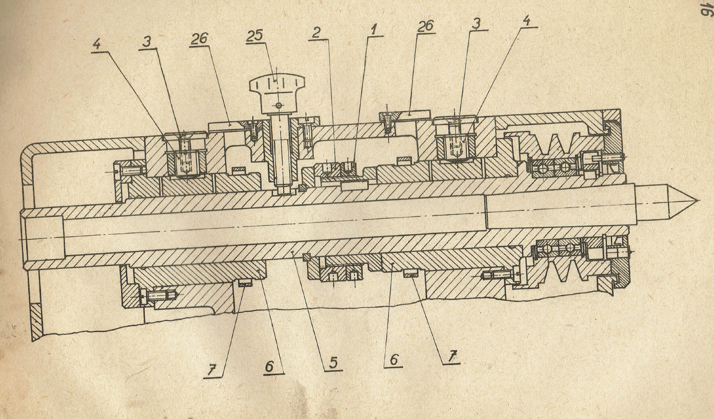 Vřeteno je v ložiskách a vždy je to boj a geometrií a vůlema. Obvykle dvě radiální a jeden axiál "někde". Vlastní vřeteno ale nemá náhon. Vřeteno ale jde zablokovat (u BUA 16 ze zadu) pak se netočí a je zpevněné.