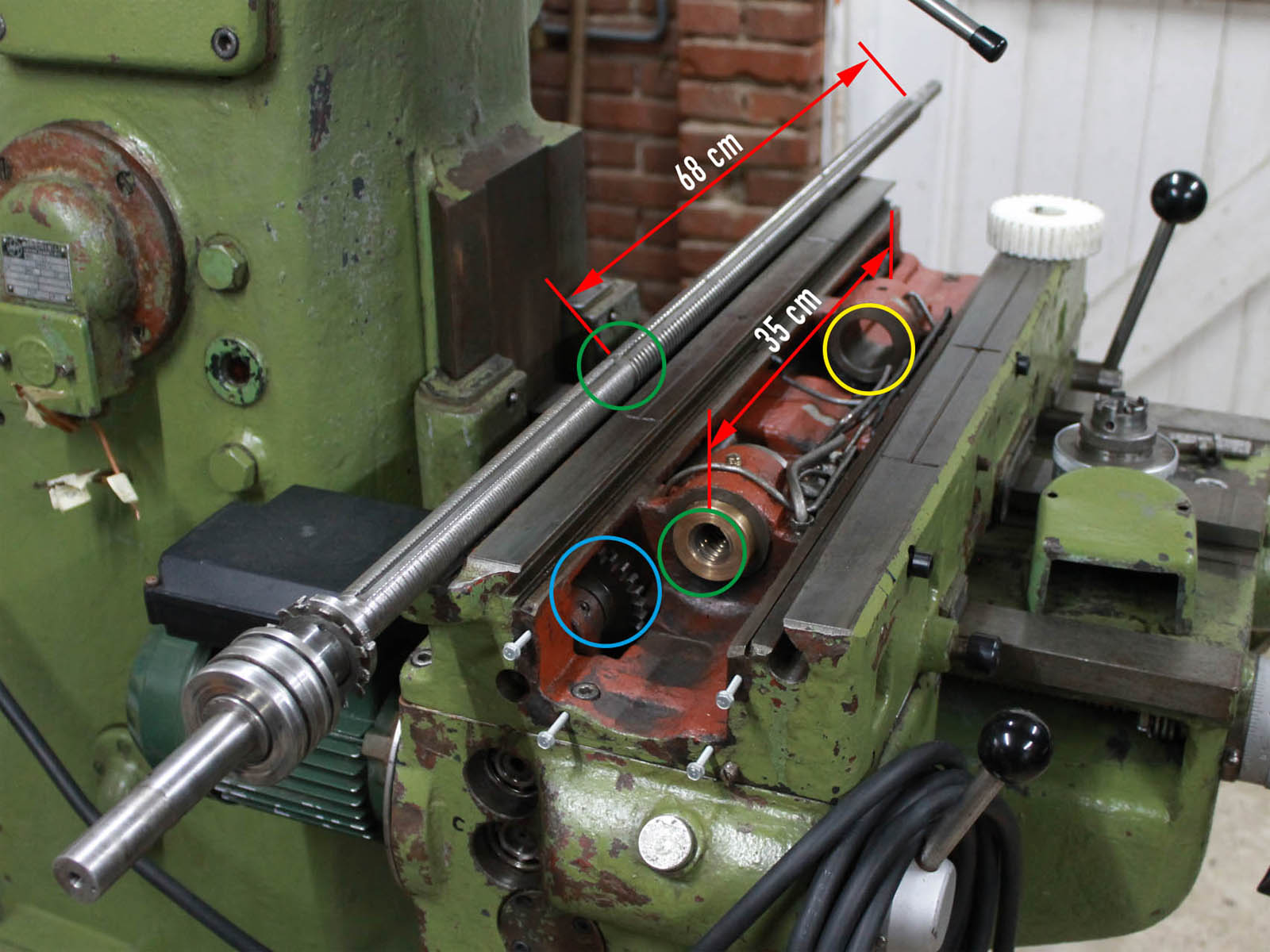 2 - lathes.co.uk říká, že tabulka může pohybovat 640 mm. To na mě v žádném případě neplatí, protože (zeleně označené) nit těsně přiléhá a dosahuje bronzové matice…