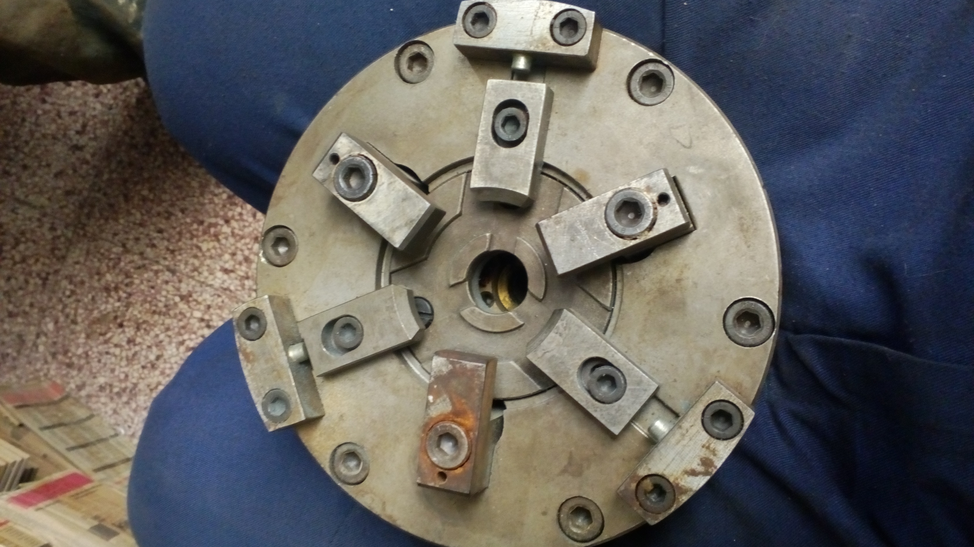 Zdravím, dostalo se mi do ruky tento druh universálky, 3 čelisti jsou malinko štelovací v posuvu (5mm) a zbyé 3 čelisti jsou přes pružinu výklopné do středu.