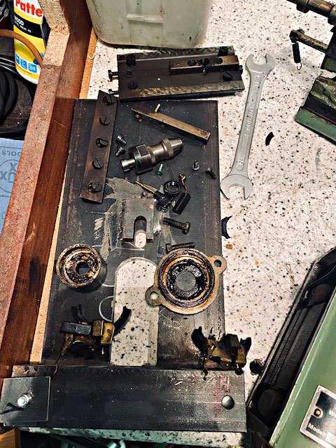 Před časem jsem si pořídil vrtačku na plošné spoje. Měli jsme jí ve fabrice a naprostá spokojenost. Když jsem jí viděl na Aukru, tak jsem po ní skočil. Původně spinkala v Akademii věd. Bohužel někdy v průběhu svého dlouhého života r(.v. 1956) byla napadena snaživým kutilem, nebo akademikem ??, v každém případě to bylo k horšímu. Na odlitek řídící "kapličky" byl zezadu přišroubovanej trafák na 24V, který napájel původní lampičku na 220V. Akorát ba mě zajímalo, kde sehnali mignonku na 24V. :lol: Při této úpravě do pancéřobky natáhli nové vodiče - klasickou bílou dvoulinku , ale při manipulaci v prostoru motoru zprasili držák uhlíků. Byl jenom prasklej, na funkci to nemělo vliv. Protože vrtačka prakticky nepracovala, v AV se nepracuje, tam se přemýšlí, a tak byly všechny mazadla totálně vyschlé. Po promazání se všechno zlepšilo, ale ve výsledku nic moc a hlavně tam byla ještě jedna elektrická chybka.