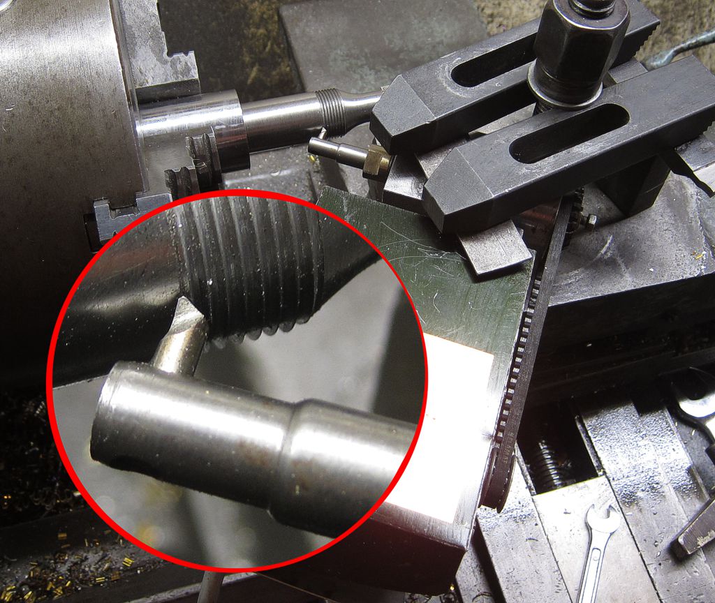 Dneska jsem potřeboval říznout závit 25x1,5 do trochu houževnatějšího materiálu. Očko takového rozměru nemám, nůž to trhal, tak jsem ten závit frézoval suportovou frézkou. Vybrousit nožík dalo trochu přemýšlení, frézka je slabá, tak to chvíli trvalo, ale výsledek je slušný :)